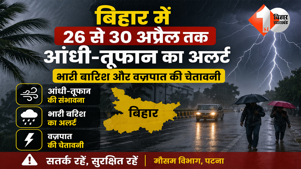 PATNA: मौसम विभाग, पटना ने 26 से 30 अप्रैल के बीच पूरे बिहार के लिए अलर्ट जारी किया है। इस अवधि में आंधी-तूफान, बारिश और वज्रपात की संभावना जताई गई है, जिससे लोगों को सतर्क रहने की सलाह दी गई है।