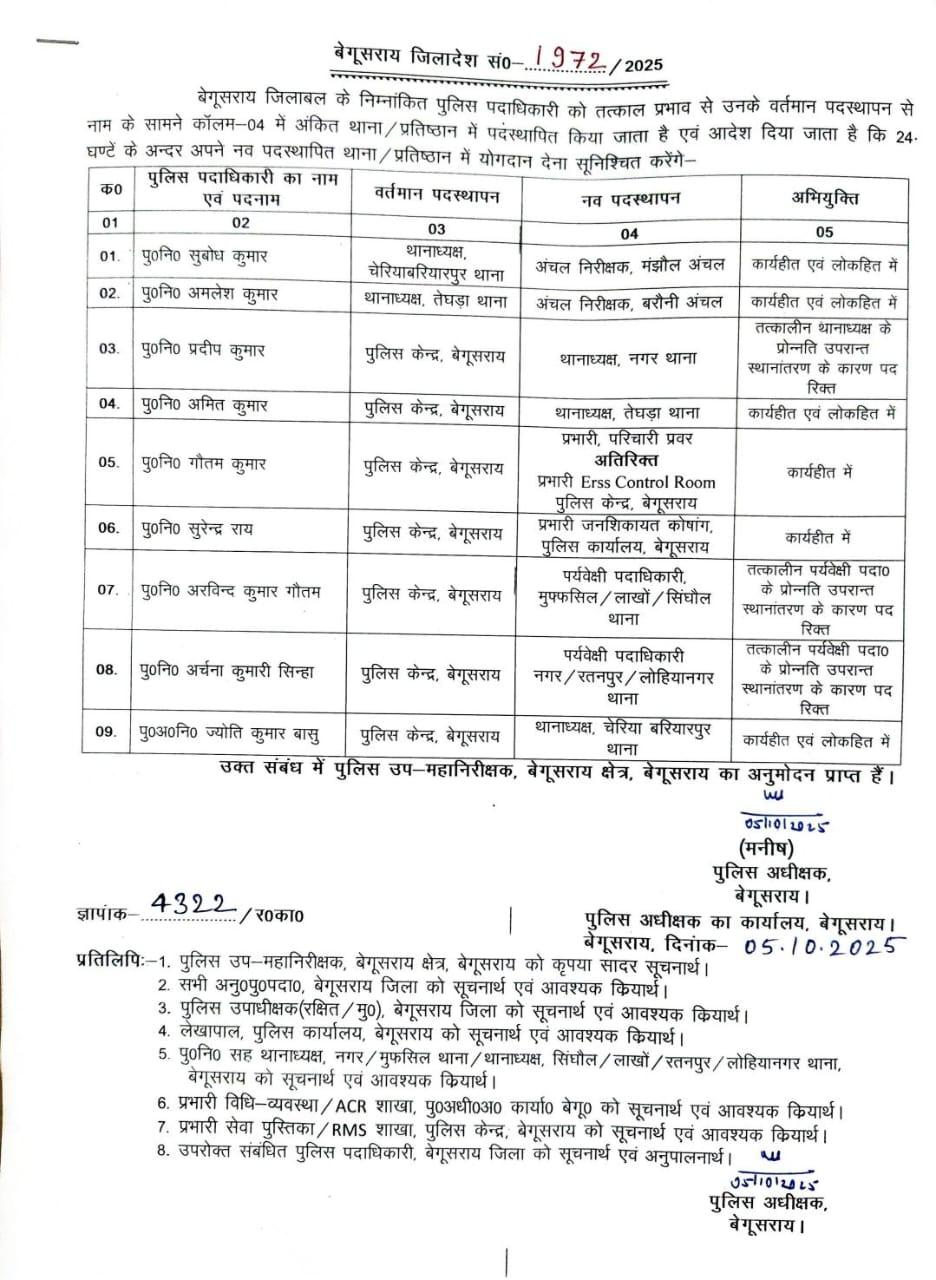 BEGUSARAI: बेगूसराय में 9 पुलिस पदाधिकारियों का तबादला किया गया है। चेरियाबरियारपुर थानाध्यक्ष पुलिस निरीक्षक सुबोध कुमार को मंझौल अंचल का अंचल निरीक्षक बनाया गया है।