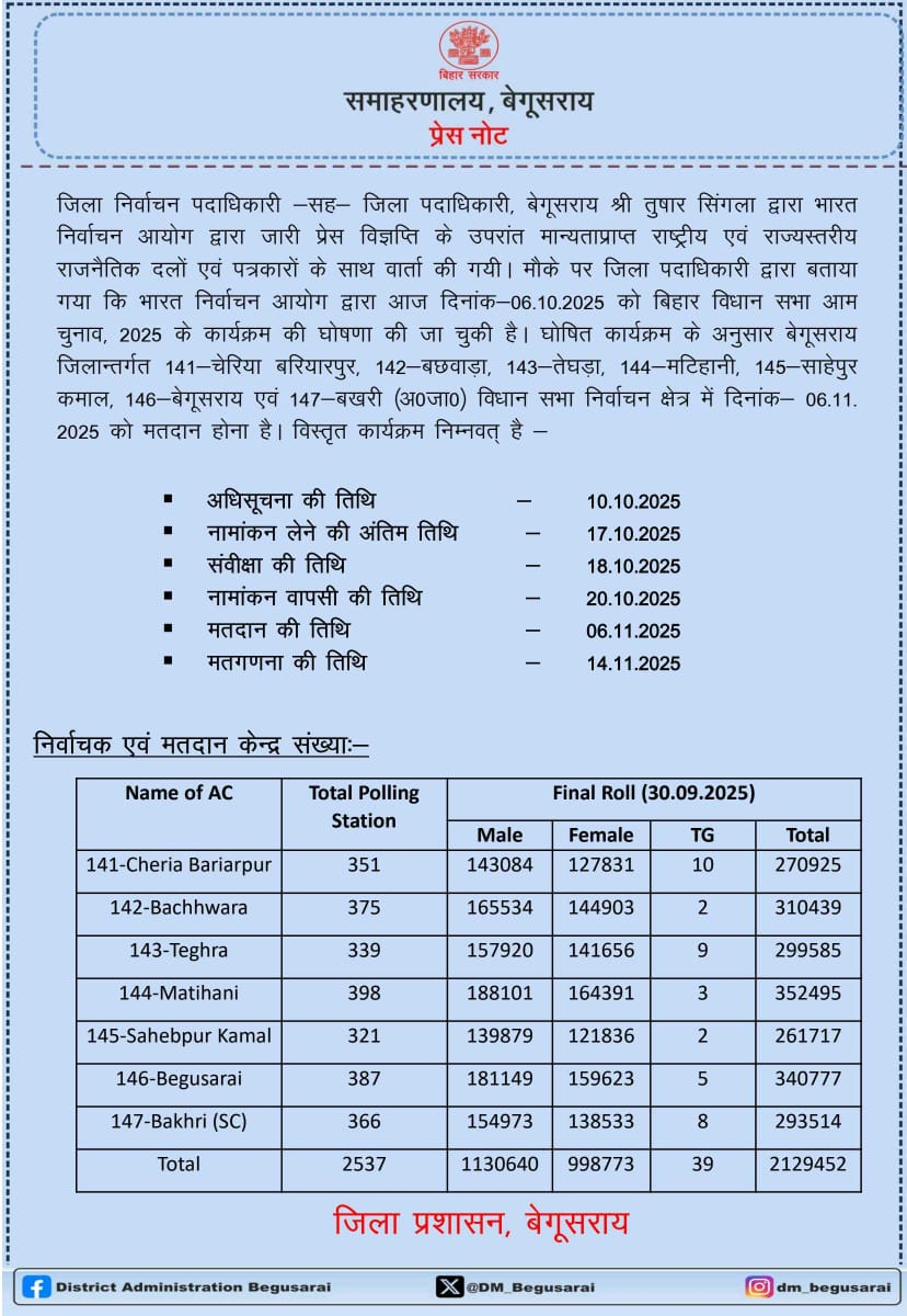 बेगूसराय जिले के मतदाताओं का आंकड़ा भी जारी किया गया है। जिले में कुल 21 लाख 29 हजार 452 मतदाता हैं, जिनमें पुरुष मतदाता 11 लाख 30 हजार 640, महिला मतदाता 9 लाख 98 हजार 773 और थर्ड जेंडर मतदाता 39 हैं। वहीं, पूरे जिले में 2,537 पोलिंग स्टेशन बनाए गए हैं।