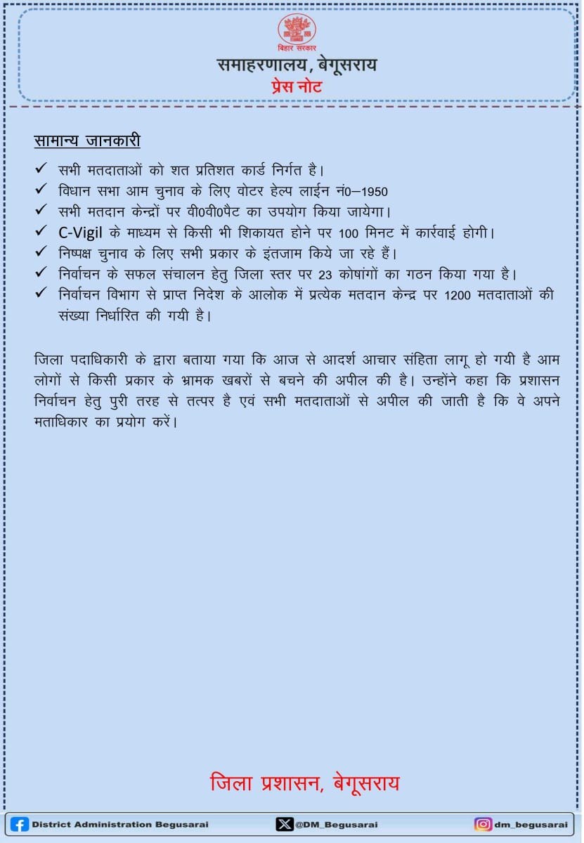 डीएम ने बताया कि बेगूसराय ज़िले के सात विधानसभा क्षेत्रों चेरिया बरियारपुर, बछवारा, तेघड़ा, मटिहानी, साहेबपुर कमाल, बेगूसराय और बखरी में मतदान होगा। इन सभी क्षेत्रों में आचार संहिता लागू कर दी गई है और प्रशासन के स्तर से कड़ी निगरानी रखी जा रही है। उन्होंने कहा कि चुनाव आयोग के दिशा-निर्देशों के अनुसार हर बूथ पर पर्याप्त सुरक्षा व्यवस्था की जाएगी ताकि मतदाता बिना भय के मतदान कर सकें।