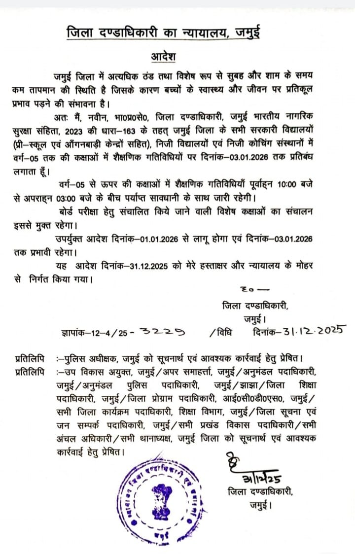 जिसके कारण बच्चों के स्वास्थ्य पर प्रतिकूल प्रभाव पड़ने की संभावनाओं को देखते हुए जमुई के सभी सरकारी विद्यालयों जिसमें प्री-स्कूल एवं आंगनबाड़ी केन्द्र भी शामिल है और प्राइवेट स्कूलों एवं प्राइवेट कोचिंग संस्थानों में कक्षा पांचवी तक की कक्षाओं में शैक्षणिक गतिविधियों पर 3 जनवरी 2026 तक प्रतिबंध लगाया गया है। शनिवार तक ये बंद रहेंगे। वही पांचवी कक्षा के ऊपर की कक्षाओं में शैक्षणिक गतिविधियां सुबह 10 बजे से 3 बजे के बीच पर्याप्त सावधान के साथ जारी रहेगी। वही बोर्ड परीक्षा हेतु संचालित किये जाने वाली विशेष कक्षाओं का संचालन इससे मुक्त रहेगा। यह आदेश 1 जनवरी 26 से लागू होगा एवं 3 जनवरी 26 तक प्रभावी रहेगा।