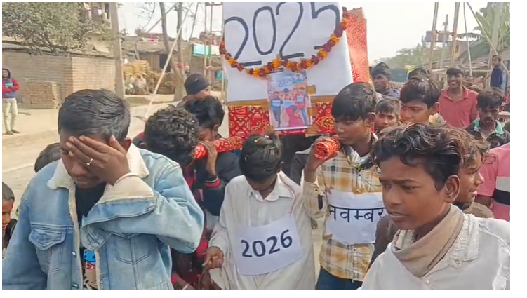 यह अनोखा नजारा मुंगेर के बरियारपुर थाना क्षेत्र अंतर्गत एनएच-80 पर देखने को मिला। बच्चों की टोली चार कंधों पर “वर्ष 2025” की अर्थी उठाए चल रही थी। आगे-आगे कुछ बच्चे सफेद धोती लपेटे हुए, हाथ में घईला में जलती अग्नि लेकर “राम नाम सत्य है” के नारे लगाते नजर आए। पूरी प्रक्रिया हूबहू एक पारंपरिक शव यात्रा जैसी थी।