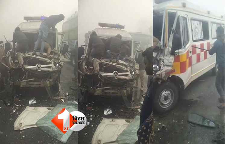 Bihar Road Accident: उत्तर बिहार में भीषण ठंड के साथ गिर रहे घने कोहरे ने रफ्तार पर ब्रेक लगा दिया है। मुजफ्फरपुर-दरभंगा नेशनल हाईवे पर सोमवार की सुबह घने धुंध के कारण एक भीषण सड़क हादसा हो गया। बेनीबाद थाना क्षेत्र के केवटसा मोड़ के समीप विजिबिलिटी कम होने की वजह से तीन एंबुलेंस सहित लगभग आधा दर्जन वाहन आपस में टकरा गए। इस जबरदस्त भिड़ंत में असम नंबर की एक एंबुलेंस के परखच्चे उड़ गए और उसमें सवार चालक समेत तीन लोग गंभीर रूप से घायल हो गए।
