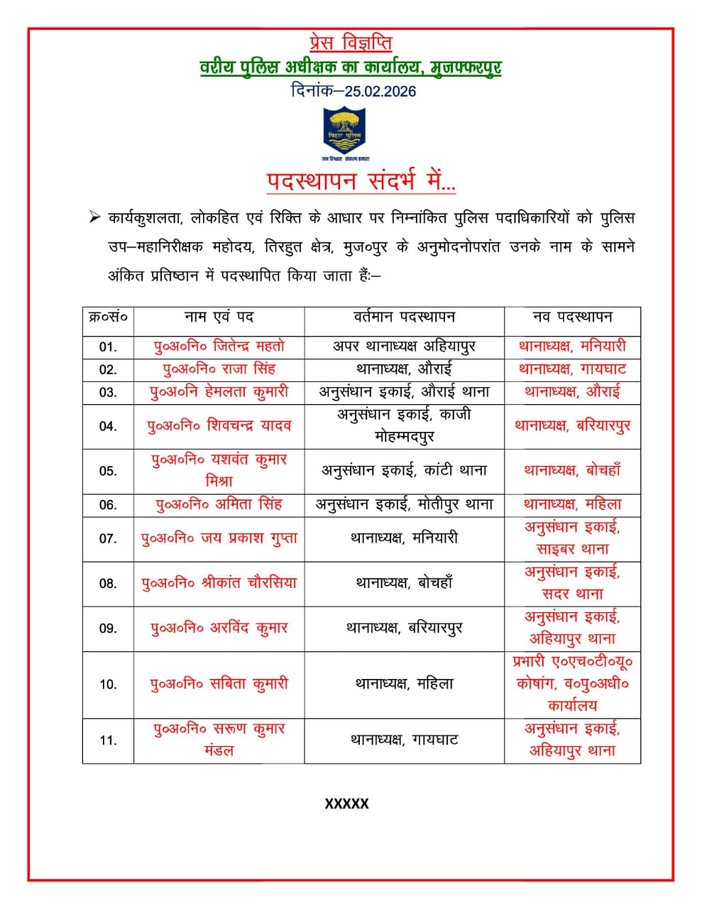 अहियापुर थाने के एसएचओ जितेंद्र महतो को मनियारी का थानेदार बनाया गया है। औराई के थानेदार राजा सिंह को गायघाट का थानाध्यक्ष बनाया गया है। वहीं हेमलता कुमारी को औराई थाने का थानेदार नियुक्त किया गया है। काजी मोहम्मदपुर थाने में तैनात शिवचंद्र यादव को बरियारपुर का एसएचओ बनाया गया है। वहीं कांटी थाना में तैनात यशवंत कुमार मिश्रा को बोचहां का थानेदार बनाया गया है। मोतिपुर थाना में तैनात अमिता सिंह को महिला थाने का थानाध्यक्ष बनाया गया है।