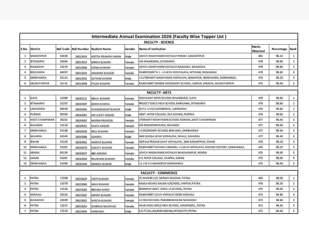 MUZAFFARPUR: बिहार विद्यालय परीक्षा समिति ने इंटर परीक्षा का रिजल्ट आज जारी कर दिया है। शिक्षा मंत्री सुनील कुमार और बिहार विद्यालय परीक्षा समिति के अध्यक्ष आनंद किशोर ने आर्ट्स, साइंस और कॉमर्स का रिजल्ट एक साथ जारी किया। मुजफ्फरपुर की बिटिया पलक कुमारी ने अपनी प्रतिभा का परचम लहराया है। विज्ञान संकाय (Science Faculty) की छात्रा पलक ने 95 प्रतिशत अंक लाकर राज्य स्तरीय वरीयता सूची (Merit List) में पांचवा स्थान (All Bihar Rank 5) हासिल किया है।