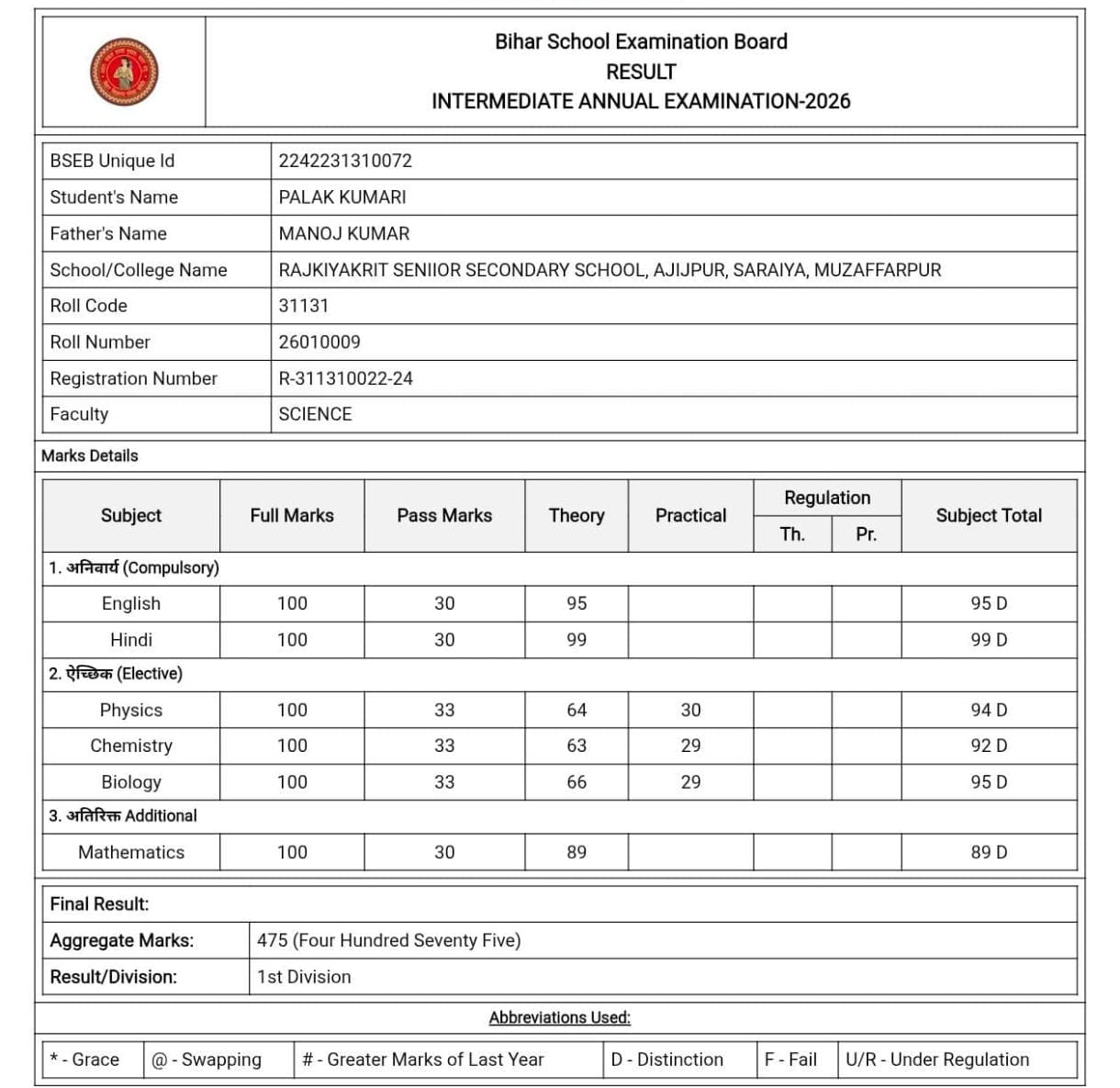 राजकीयकृत सीनियर सेकेंडरी स्कूल, अजीजपुर (सरैया) की छात्रा पलक (रोल कोड: 26010009, रोल नंबर: 31131) ने विज्ञान के विषयों में अपनी गहरी समझ और कठिन परिश्रम के बल पर कुल 475 अंक प्राप्त किए। मुजफ्फरपुर जैसे जिले से निकलकर बिहार के टॉपर्स की सूची में जगह बनाना उनकी उत्कृष्ट शैक्षणिक क्षमता को दर्शाता है।
