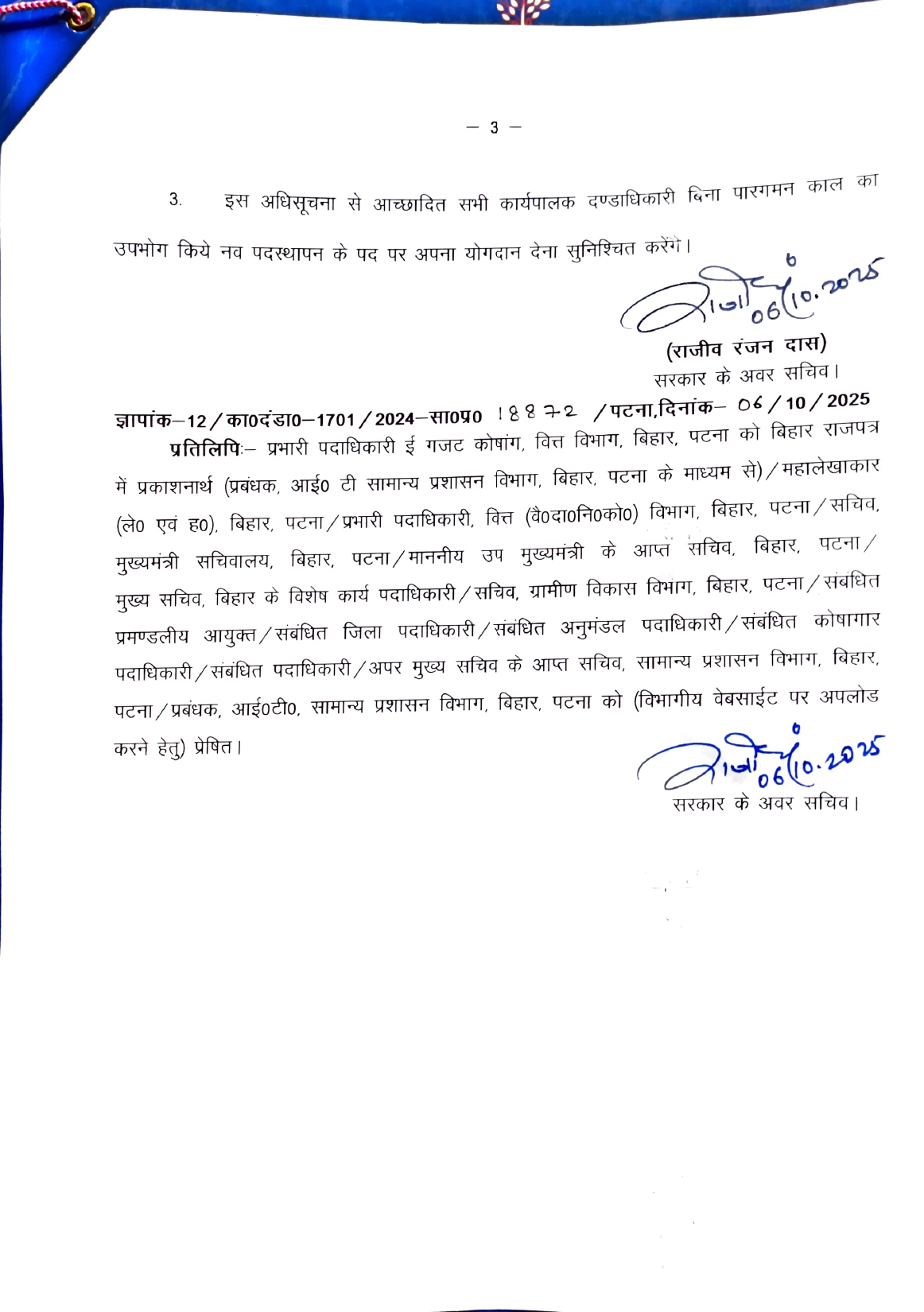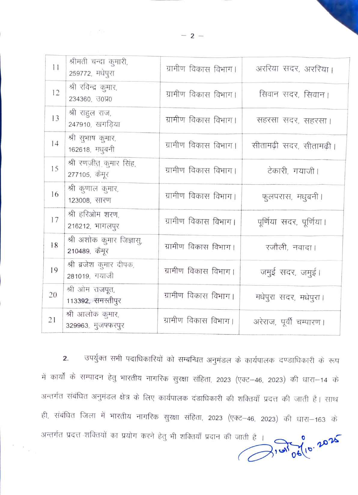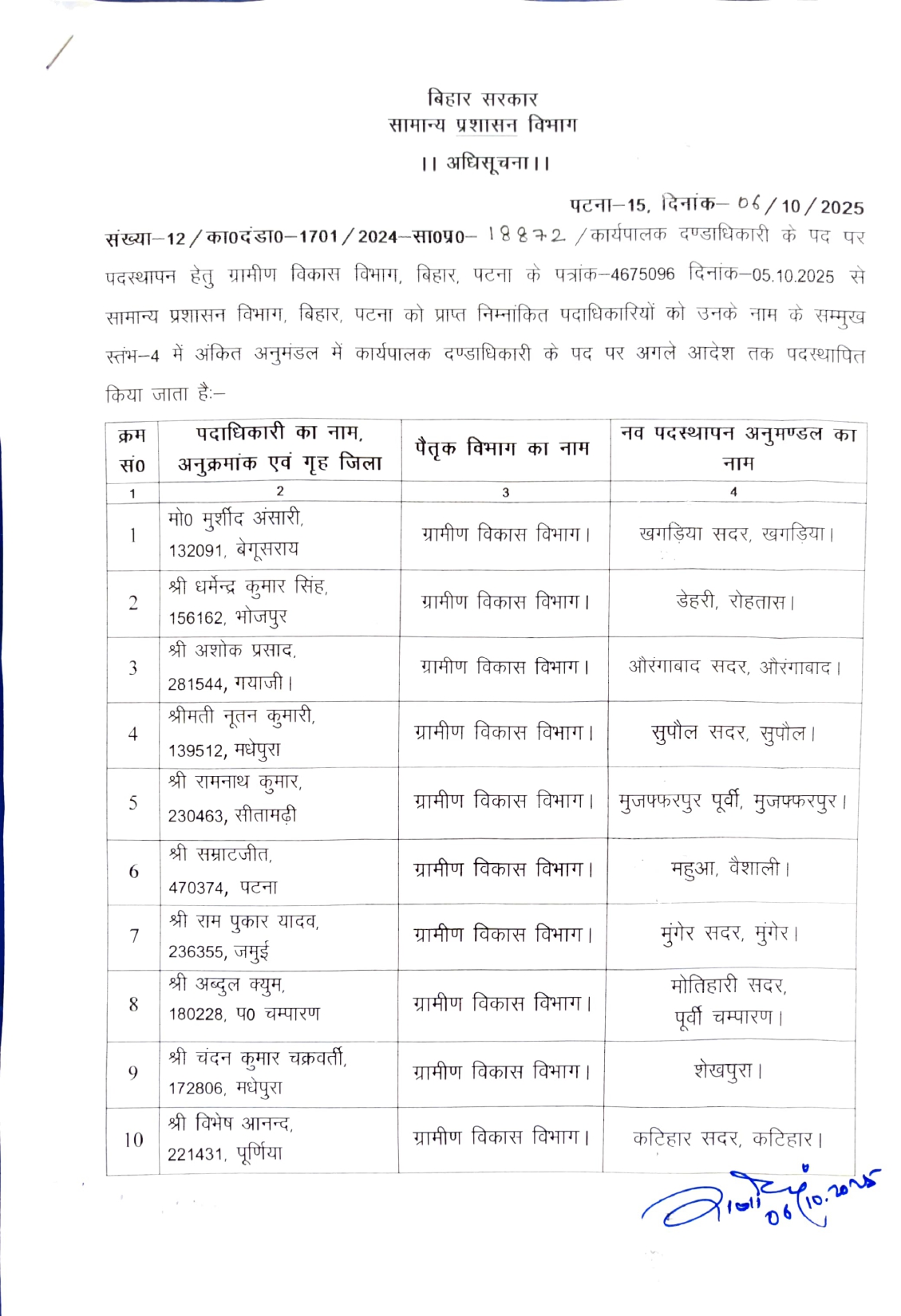 सामान्य प्रशासन विभाग की तरफ से जारी अधिसूचना में कहा गया कि, “कार्यपालक दण्डाधिकारी के पद पर पदस्थापन हेतु ग्रामीण विकास विभाग, बिहार, पटना के पत्रांक-4675096 दिनांक-05.10.2025 से सामान्य प्रशासन विभाग, बिहार, पटना को प्राप्त निम्नांकित पदाधिकारियों को उनके नाम के सम्मुख स्तंभ-4 में अंकित अनुमंडल में कार्यपालक दण्डाधिकारी के पद पर अगले आदेश तक पदस्थापित किया जाता है”।