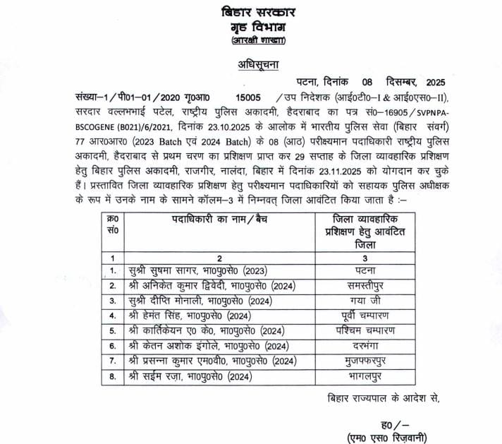 Bihar Ips officer: बिहार कैडर के 8 ट्रेनी आईपीएस अधिकारियों को जिला अलॉट कर दिया गया है। इन सभी को पटना, समस्तीपुर, गयाजी, पूर्वी चंपारण, पश्चिम चंपारण, दरभंगा, मुजफ्फरपुर एवं भागलपुर का एएसपी बनाया गया है। गृह विभाग (आरक्षी शाखा) ने इसे लेकर अधिसूचना जारी की है।