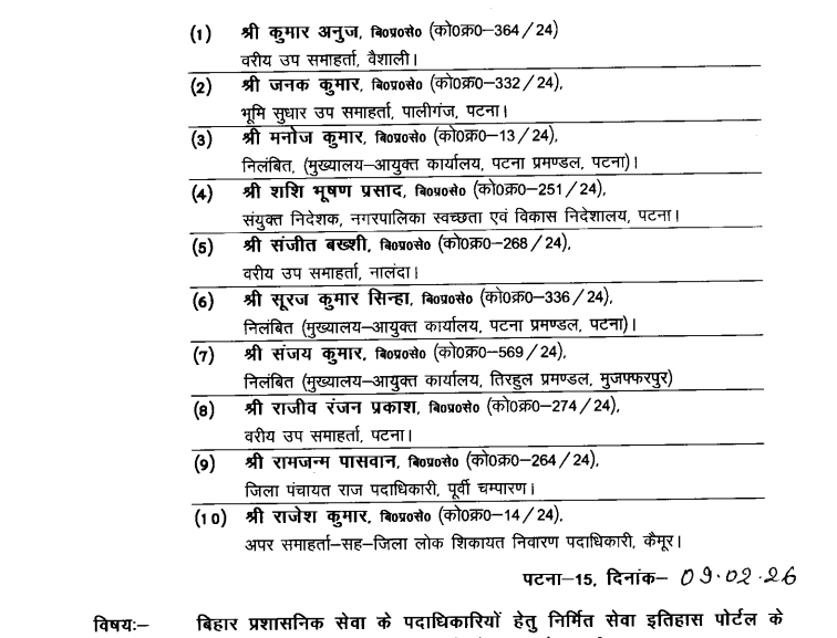 सामान्य प्रशासन विभाग ने कहा है कि बिहार प्रशासनिक सेवा के पदाधिकारी के लिए सेवा इतिहास पोर्टल पर जरूरी सूचना देना था. सभी अधिकारियों को निर्धारित तिथि पर उपस्थित होकर स्वयं की सेवा से संबंधित जानकारी इतिहास पोर्टल पर अपलोड कराना था. इन अधिकारियों के लिए बार-बार समय निर्धारित की गई, लेकिन इन लोगों ने अब तक सेवा इतिहास पोर्टल पर जानकारी अंकित नहीं कराई है. बार-बार अनुपस्थित रहे हैं. विभाग ने 7 दिनों में उपस्थित होकर जानकारी देने को कहा है.