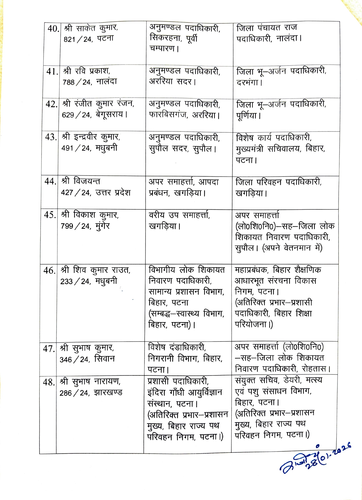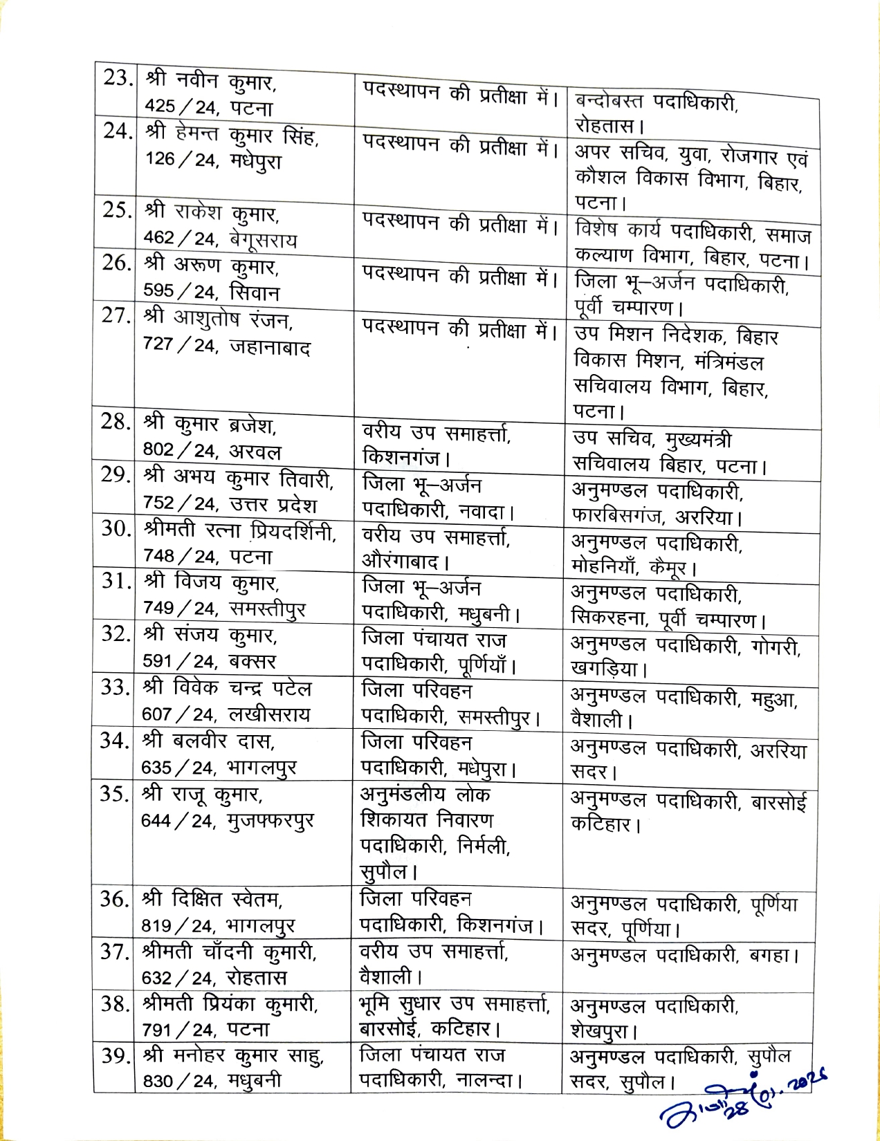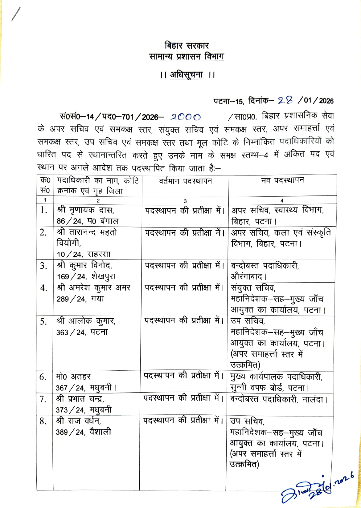बिहार प्रशासनिक सेवा के अपर सचिव एवं समकक्ष स्तर, संयुक्त सचिव एवं समकक्ष स्तर, अपर समाहर्ता एवं समकक्ष स्तर, उप सचिव एवं समकक्ष स्तर तथा मूल कोटि के पदाधिकारियों का तबादला किया गया है। स्वास्थ्य विभाग के अपर सचिव मृणायक दास बनाये गये हैं।