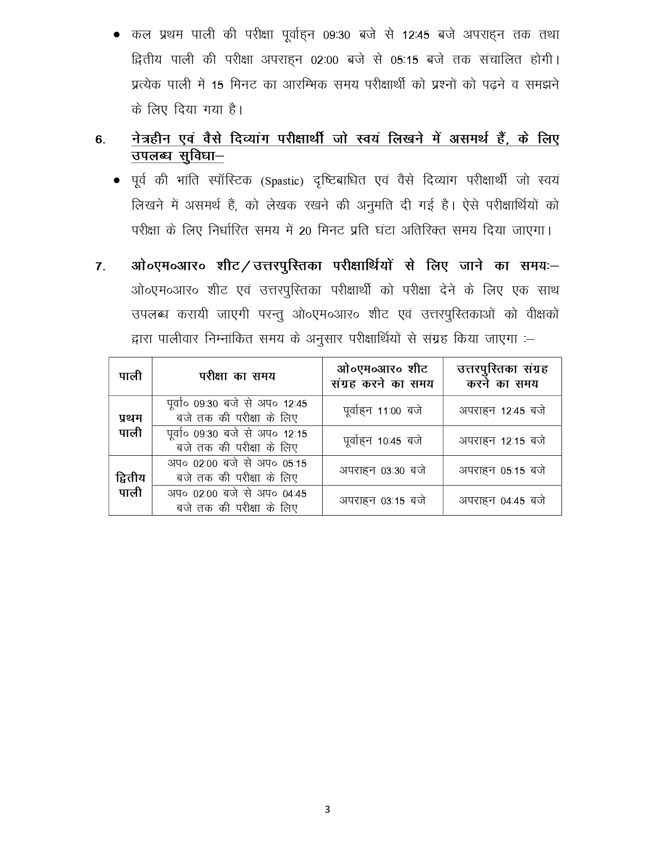 छात्राओं के लिए प्रत्येक जिले में 4 मॉडल परीक्षा केंद्र बनाये गये हैं। परीक्षा केंद्र में कोई भी पदाधिकारी, वीक्षक, कर्मी व परीक्षार्थी मोबाइल फोन लेकर नहीं जाएंगे। कुल 1699 परीक्षा केंद्रों पर परीक्षा आयोजित की जाएगी। प्रथम पाली की परीक्षा सुबह साढ़े 9 बजे से पौने एक बजे तक और द्वितीय पाली की परीक्षा दोपहर 2 बजे से शाम के सवा 5 बजे तक चलेगी। प्रत्येक पाली में 15 मिनट का आरंभिक समय परीक्षार्थियों को प्रश्नों को पढ़ने और समझने के लिए दिया गया है।