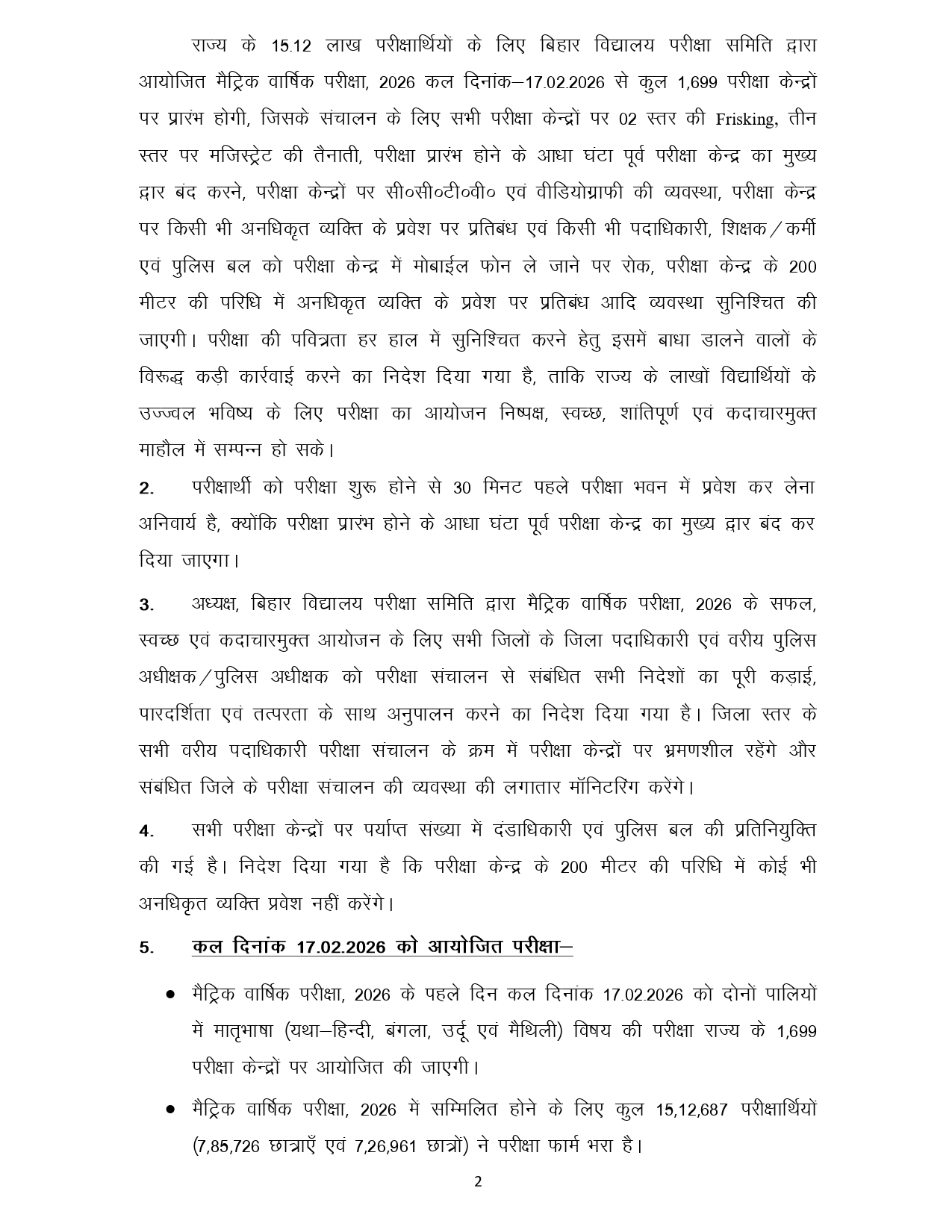 प्रथम पाली के लिए सुबह 9 बजे तक और द्वितीय पाली के लिए तय समय के बाद आने वाले छात्रों को किसी भी स्थिति में प्रवेश नहीं दिया जाएगा। परीक्षा केंद्रों पर सख्त सुरक्षा व्यवस्था की गई है। सभी केंद्र सीसीटीवी निगरानी में रहेंगे और दंडाधिकारी के साथ पुलिस बल तैनात रहेगा। विद्यार्थियों को केवल चप्पल पहनकर ही परीक्षा केंद्र में प्रवेश की अनुमति होगी। जिला पदाधिकारी निखिल धनराज ने छात्रों से अपील की है कि वे समय पर केंद्र पहुंचे, घबराएं नहीं और शांत मन से परीक्षा दें।