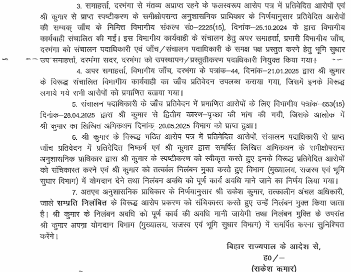 जाले अंचल के तत्कालीन सीओ राकेश कुमार के खिलाफ दरभंगा जिलाधिकारी के गंभीर आरोपों के मद्देनजर राजस्व विभाग ने 25 अक्टूबर 2024 को विभागीय कार्यवाही संचालित करने का निर्णय लिया. दरभंगा के विभागीय जांच अपर समाहर्ता को संचालन पदाधिकारी नियुक्त किया गया, वहीं भूमि सुधार उपसमाहर्ता दरभंगा सदर को प्रस्तुतीकरण पदाधिकारी बनाया गया. अपर समाहर्ता विभागीय जांच दरभंगा ने 21 जनवरी 2025 को राकेश कुमार के खिलाफ संचालित विभागीय कार्यवाही की जांच रिपोर्ट दिया. जिसमें उनके खिलाफ लगाए गए सभी आरोपों को प्रमाणित बताया गया.