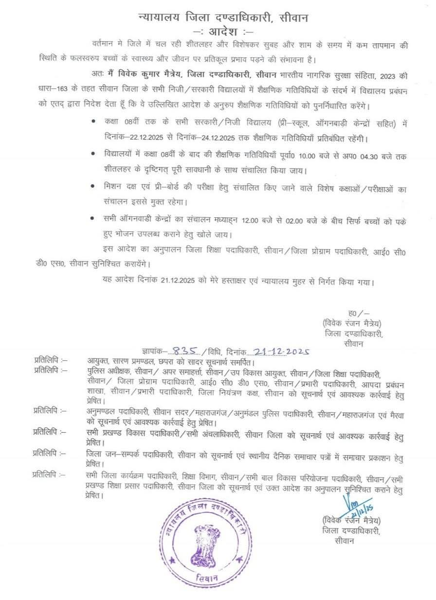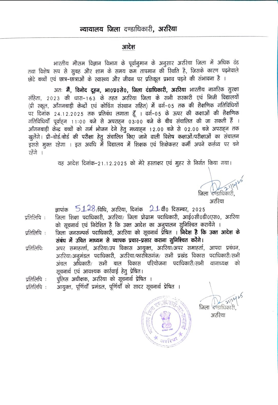 अररिया के डीएम ने स्कूल बंद करने को लेकर आदेश जारी करते हुए लिखा है कि भारतीय मौसम विज्ञान विभाग के पूर्वानुमान के अनुसार अररिया जिला में अधिक ठंड तथा विशेष रूप से सुबह और शाम के समय कम तापमान की स्थिति है, जिसके कारण पढ़नेवाले छोटे बच्चों एवं छात्र-छात्राओं के स्वास्थ्य और जीवन पर प्रतिकूल प्रभाव पड़ने की संभावना है। अतः मैं, विनोद दूहन, भा०प्र० से०, जिला दंडाधिकारी, अररिया भारतीय नागरिक सुरक्षा संहिता, 2023 की धारा-163 के तहत अररिया जिला के सभी सरकारी एवं निजी विद्यालयों (प्री स्कूल, आँगनबाड़ी केन्द्रों एवं कोचिंग संस्थान सहित) में वर्ग-05 तक की शैक्षणिक गतिविधियों पर दिनांक 24.12.2025 तक प्रतिबंध लगाता हूँ। वर्ग-05 के ऊपर की कक्षाओं की शैक्षणिक गतिविधियाँ पूर्वाह्न 11:00 बजे से अपराह्न 03:00 बजे के बीच संचालित की जा सकती हैं । आँगनबाड़ी केन्द्र बच्चों को गर्म भोजन देने हेतु मध्याह्न 12.00 बजे से 02.00 बजे अपराह्न तक खुलेंगे। प्री-बोर्ड/बोर्ड की परीक्षा हेतु संचालित किए जाने वाली विशेष कक्षाओं/परीक्षाओं का संचालन इससे मुक्त रहेगा । इस अवधि में विद्यालय में शिक्षक एवं शिक्षकत्तर कर्मी अपने कर्त्तव्य पर बने रहेंगे ।यह आदेश दिनांक-21.12.2025 को मेरे हस्ताक्षर एवं मुहर से निर्गत किया गया।