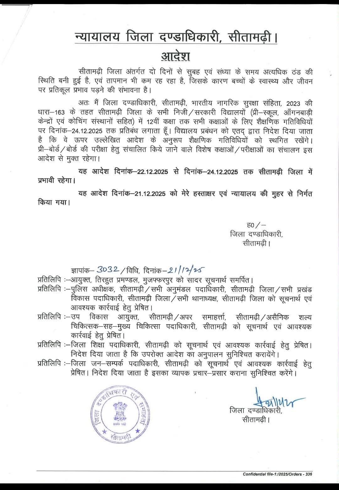जिलाधिकारी द्वारा निर्गत यह आदेश मुजफ्फरपुर जिले में 22 दिसंबर से 25 दिसंबर तक प्रभावी रहेगा। आदेश का उल्लंघन करने वाले विद्यालयों के विरुद्ध नियमानुसार कार्रवाई की जाएगी।