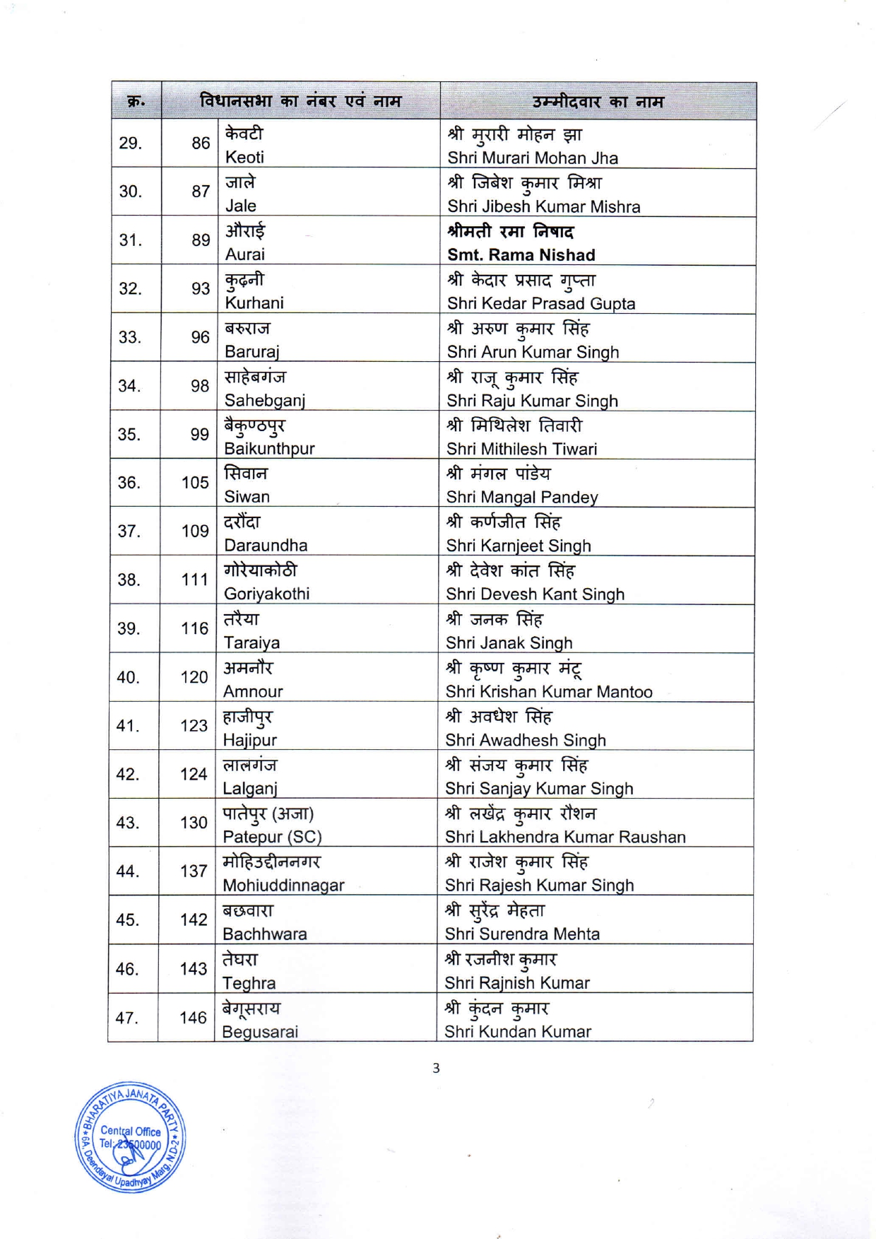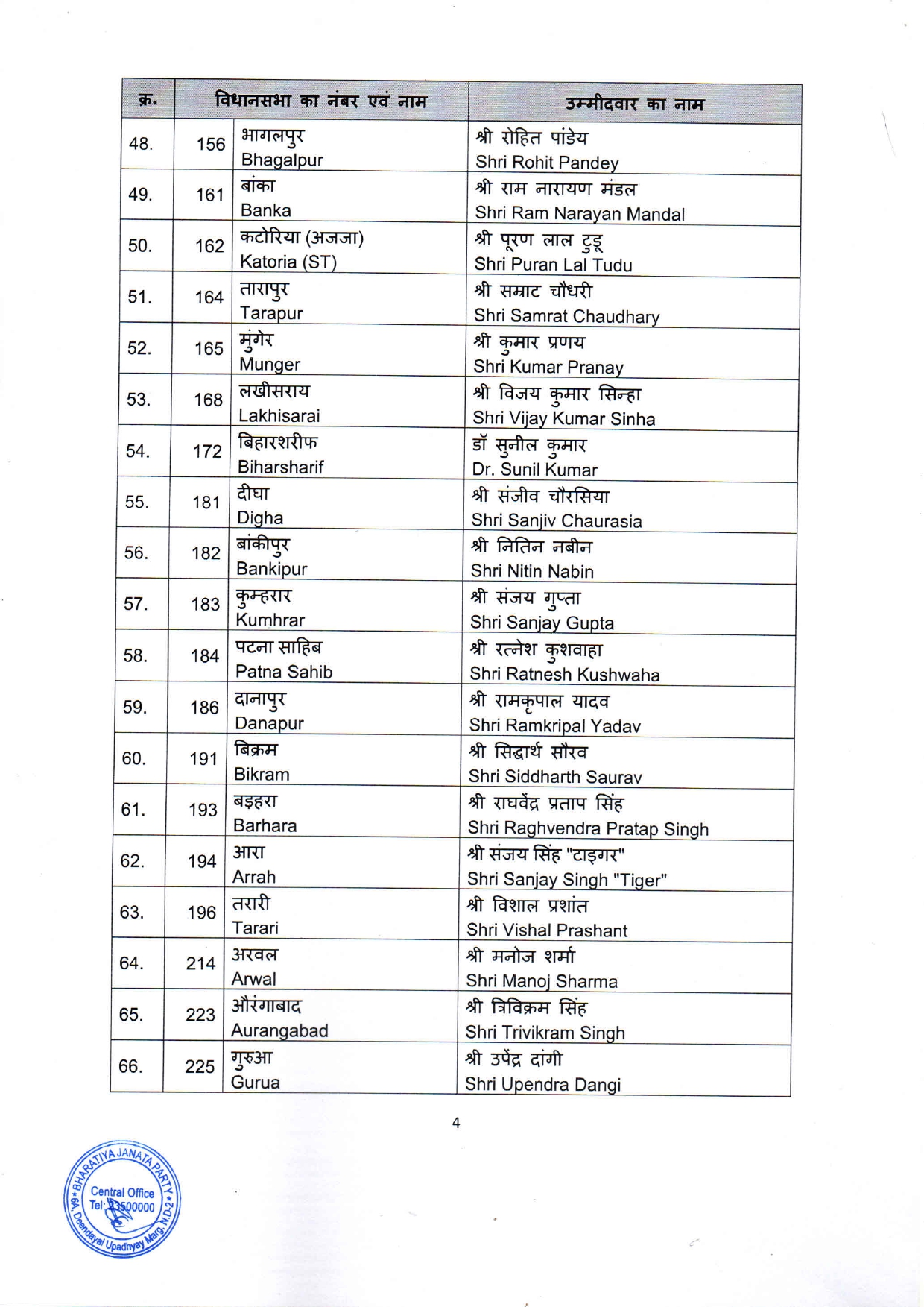 बिहार विधानसभा चुनाव 2025 के लिए बीजेपी ने पहली लिस्ट जारी की है। पहली लिस्ट में कुल 71 प्रत्याशियों को बीजेपी का टिकट दिया गया है। लखीसराय से विजय कुमार सिन्हा,दीघा से संजीव चौरसिया, बांकीपुर से नितिन नवीन, कुम्हरार से संजय गुप्ता, दानापुर से रामकृपाल यादव, पटना साहिब से रत्नेश कुशवाहा, गया से प्रेम कुमार, जमुई से श्रेयसी सिंह सहित कुल 71 प्रत्याशियों का नाम बीजेपी की पहली लिस्ट में मौजूद है. पटना साहिब और कुम्हरार विधानसभा सीट पर नये प्रत्याशी को उतारा गया है। पटना साहिब से नंदकिशोर यादव और कुम्हरार से अरुण कुमार सिन्हा का टिकट कट गया है। बता दें कि सीट बंटवारे के बाद बीजेपी को एनडीए गठबंधन में 101 सीटें मिली हैं, शेष सीटों पर उम्मीदवारों की घोषणा अगली सूची में की जाएगी।