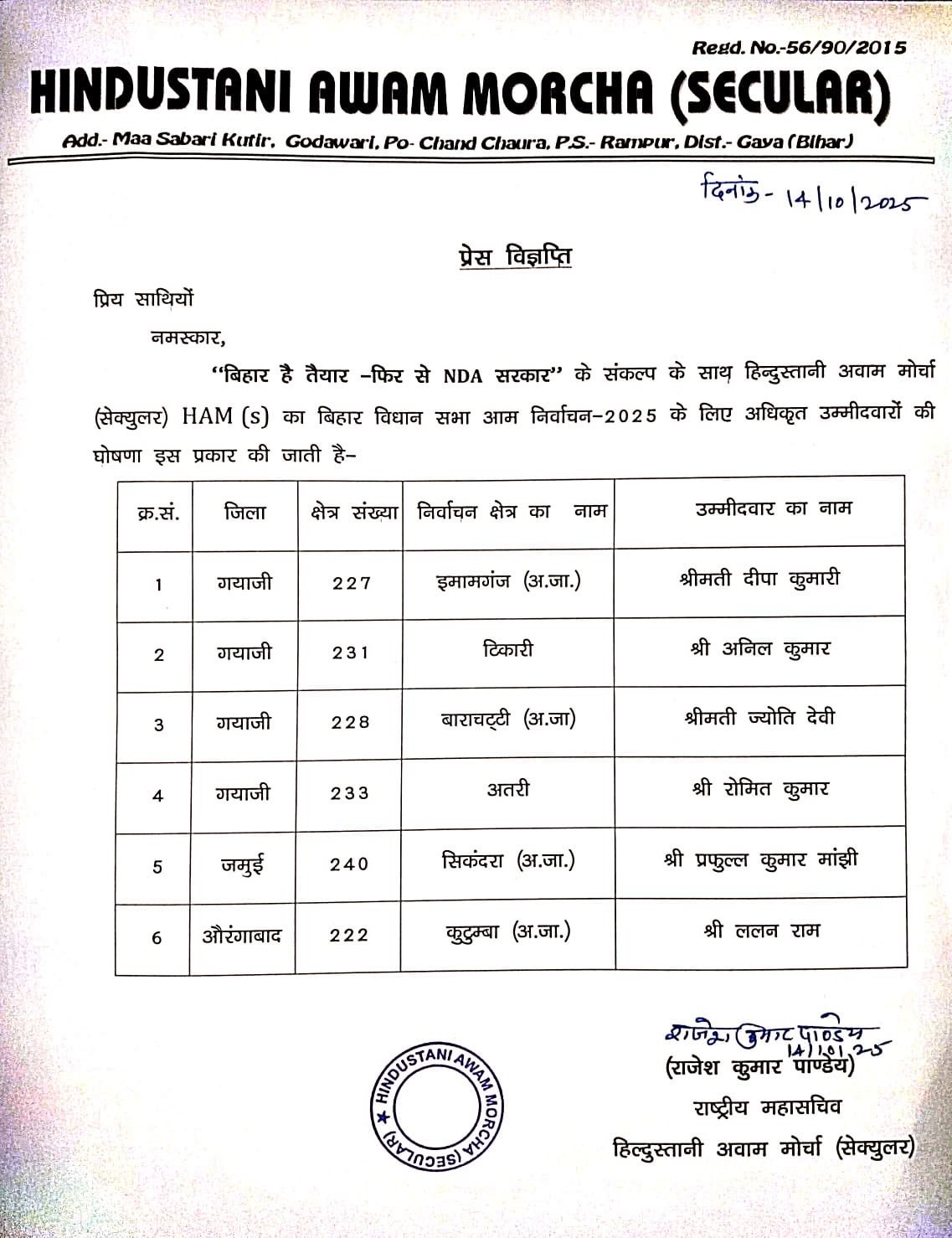हिन्दुस्तानी अवाम मोर्चा (सेक्युलर) के राष्ट्रीय महासचिव राजेश कुमार पांडेय ने इस बात की जानकारी दी है। उन्होंने कहा कि बिहार है तैयारा-फिर से एनडीए सरकार के साथ हम तैयार है। इमामगंज से दीपा कुमारी, टिकारी से अनिल कुमार, बाराचट्टी से ज्योति देवी, अतरी से रोमित कुमार, सिकंदरा से प्रफुल्ल कुमार मांझी और कुटुम्बा से ललन राम को जीतन राम मांझी ने सिंबल दिया है।