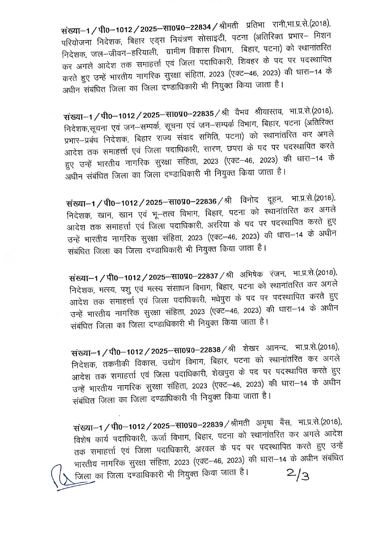 प्रतिभा रानी को शिवहर का नया जिलाधिकारी बनाया गया है। सूचना जनसंपर्क विभाग के निदेशक वैभव श्रीवास्तव को सारण का जिलाधिकारी बनाया गया है। खान निदेशक विनोद दुहन को अररिया जिला अधिकारी बनाया गया है। निदेशक मत्स्य विभाग अभिषेक रंजन को मधेपुरा का जिलाधिकारी, उद्योग विभाग में निदेशक शेखर आनंद को जिलाधिकारी शेखपुरा, ऊर्जा विभाग में विशेष कार्य पदाधिकारी अमृषा बैंस को अरवल का जिलाधिकारी, प्राथमिक शिक्षा के निदेशक साहिला को बक्सर का जिलाधिकारी और कृषि विभाग में निदेशक नितिन कुमार सिंह को कैमूर का जिलाधिकारी बनाया गया है।