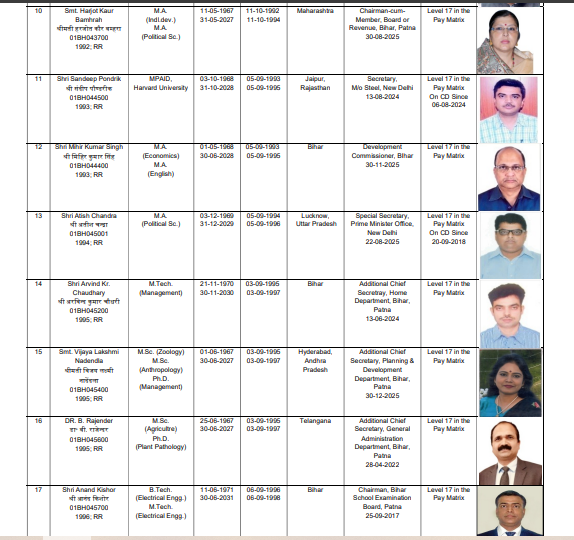 बिहार के मुख्य सचिव प्रत्यय अमृत रैंकिंग में चौथे नंबर पर हैं, जो 31 जुलाई 2027 को सेवानिवृत्ति होंगे. पांचवें नंबर पर सी. के. अनिल हैं, जो बिहार के राजस्व एवं भूमि सुधार विभाग के प्रधान सचिव हैं. ये 31 दिसंबर 2027 को सेवानिवृत्ति होंगे. छठे नंबर पर राजित पुनहानि हैं, यह भी केंद्रीय प्रतिनियुक्ति पर हैं. लिस्ट में सातवें नंबर पर बिहार के विकास आयुक्त दीपक कुमार सिंह हैं. आठवें नंबर पर अरूणीश चावला हैं जो भारत सरकार में सचिव हैं. नौवें नंबर पर चंचल कुमार हैं. यह भी केंद्रीय प्रतिनियुक्ति पर हैं. हरजोत कौर बम्हारा 10 नंबर पर हैं,यह अध्यक्ष राजस्व पर्षद के पद पर पदस्थापित हैं.