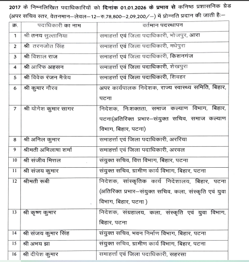भागलपुर के जिलाधिकारी नवल किशोर चौधरी, मुजफ्फरपुर के जिलाधिकारी सुब्रत कुमार सेन, पथ निर्माण विभाग की अपर सचिव शैलजा शर्मा, पश्चिम चंपारण के डीएम धर्मेंद्र कुमार, बांका जिलाधिकारी नवदीप शुक्ला, मधुबनी जिलाधिकारी आनंद शर्मा, जमुई जिला अधिकारी नवीन समेत कई जिलों के डीएम को प्रोन्नति दी गई है. वहीं, भारतीय प्रशासनिक सेवा के 16 अधिकारियों को 1 जनवरी 2026 के प्रभाव से अपर सचिव वेतन लेवल- 12 में प्रमोशन दिया गया है. इस लिस्ट में भी कई जिलों के जिलाधिकारी शामिल हैं.