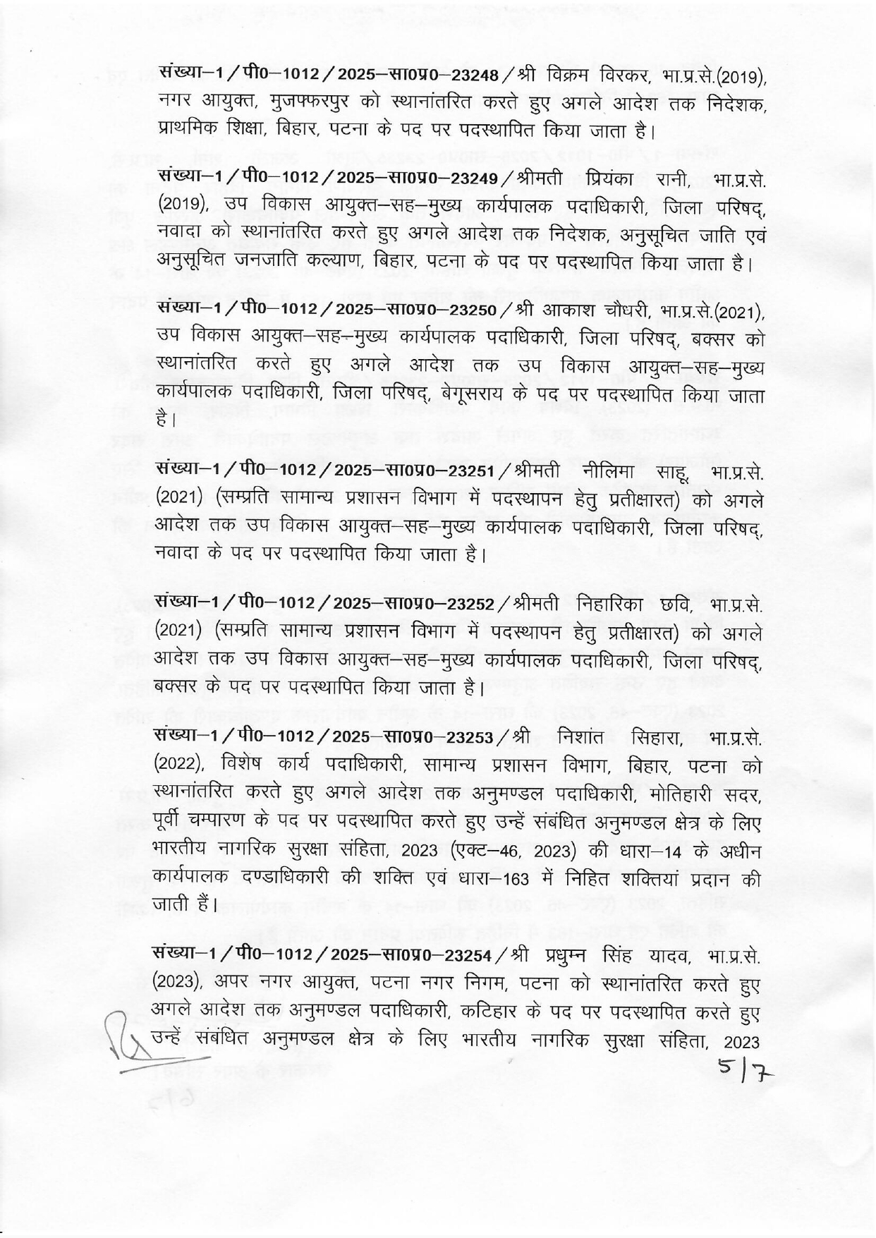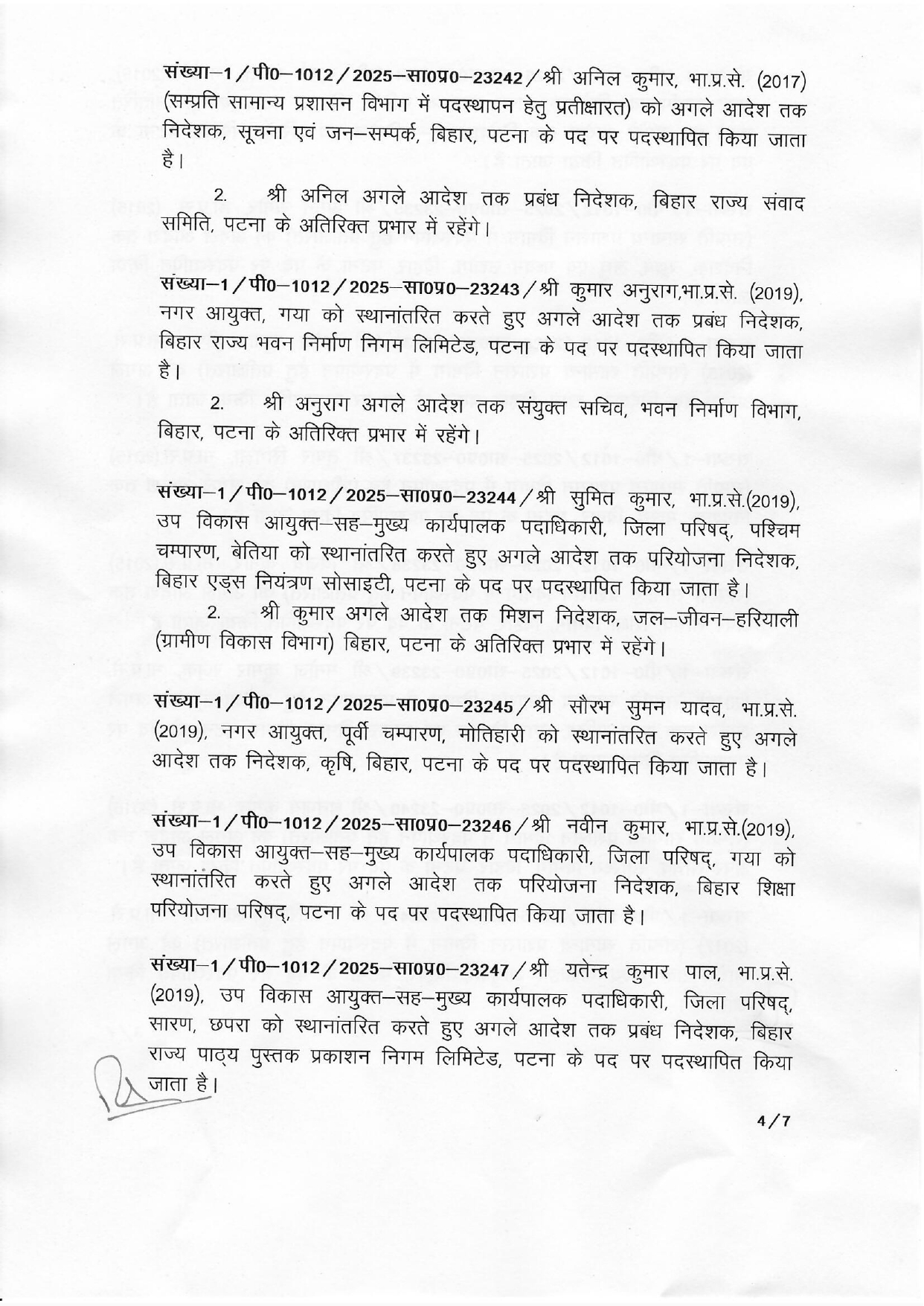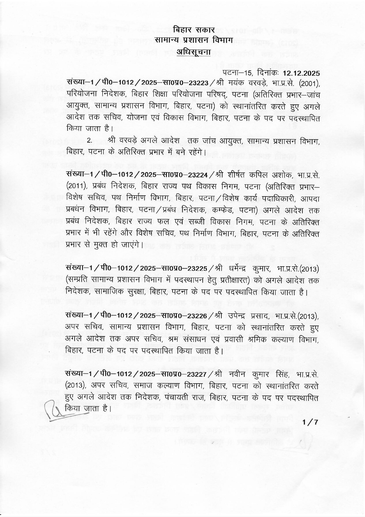 बिहार राज्य पथ विकास निगम के प्रबंध निदेशक शीर्षत कपिल अशोक बिहार राज्य फल एवं सब्जी विकास निगम के प्रबंध निदेशक के अतिरिक्त प्रभार में रहेंगे लेकिन पथ निर्माण विभाग के विशेष सचिव के अतिरिक्त प्रभार से मुक्त हो जाएंगे। वही 2013 बैच के आईएएस धर्मेन्द्र कुमार जो सामान्य प्रशासन विभाग में पदस्थापन के लिए प्रतीक्षारत थे उन्हें सामाजिक सुरक्षा का निदेशक बनाया गया है।