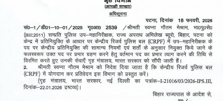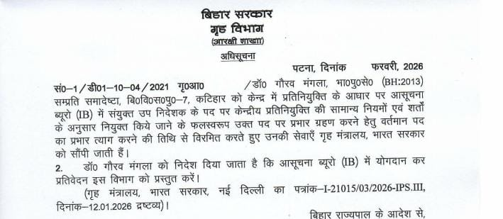 इसके अलावा 2013 बैच के आईपीएस अधिकारी गौरव मंगला को इंटेलिजेंस ब्यूरो (IB) में प्रतिनियुक्त किया गया है। बिहार सरकार द्वारा जारी अधिसूचना के बाद संबंधित अधिकारियों की केंद्रीय स्तर पर नई जिम्मेदारियां तय की गई हैं।
