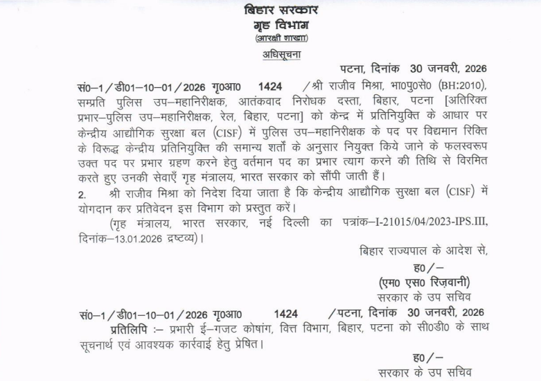 आतंकवाद निरोधक दस्ता के पुलिस उप महानिरीक्षक राजीव मिश्रा केंद्रीय प्रतिनियुक्ति पर चले गए हैं. इन्हें सीआईएसफ में पुलिस उप महानिरीक्षक के पद पर पोस्टिंग मिली है. लिहाजा बिहार सरकार ने राजीव मिश्रा को केंद्रीय प्रतिनियुक्ति पर जाने को लेकर विरमित कर दिया है. इनकी सेवाएं गृह मंत्रालय को सौंप दी गई है .