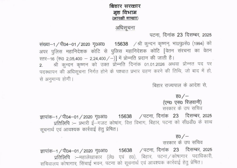 बता दें कि एडीजी कुंदन कृष्णन 1994 बैच के IPS अधिकारी हैं। कुंदन कृष्णन को 1 जनवरी 2026 से प्रभावी रूप से पुलिस महानिदेशक (DG) रैंक में पदोन्नत किया है। वो पहले ADG (अपर पुलिस महानिदेशक) के पद पर थे। कुंदन कृष्णन को अपर पुलिस महानिदेशक (ADG) से पुलिस महानिदेशक (DG) कोटि में प्रोन्नति दी गई है। उनकी यह प्रोन्नति 1 जनवरी 2026 से प्रभावी होगी। वे वर्तमान में केंद्र सरकार के अंतर्गत प्रतिनियुक्ति पर हैं और पदभार ग्रहण करने की तिथि से उनकी यह नई रैंक मान्य होगी।
