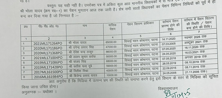 पटना सचिवालय कोषागार के वरीय कोषागार पदाधिकारी ने 11 दिसंबर 2025 को वित्त विभाग के संयुक्त आयुक्त को पत्र लिखा. जिसमें सूचना के अधिकार के तहत विधायक, विधान पार्षदों के पेंशन भुगतान की प्रारंभ की तिथि तथा उनके पेंशन जारी रहने के संबंध में जानकारी दी गई थी. इस पत्र के आलोक में वरीय कोषागार पदाधिकारी ने बताया कि आरटीआई कार्यकर्ता शिव प्रकाश राय ने सूचना के अधिकार के तहत जानकारी मांगी थी. सूचना प्रदान करने क्रम में यह पत्र निर्गत किया गया है . आवेदक ने 8 विधायकों के पेंशन प्रारंभ की तिथि के बारे में सूचना मांगी थी, जिसे इस कार्यालय के द्वारा उपलब्ध कराया गया था. हालांकि यह खबर मीडिया में आई तो इसका अर्थ निकाला जा रहा है कि संबंधित माननीयों की पेंशन अभी भी जारी है. इससे भ्रम की स्थिति उत्पन्न हुई है कि वह पेंशन तथा वेतन दोनों प्राप्त कर रहे हैं.