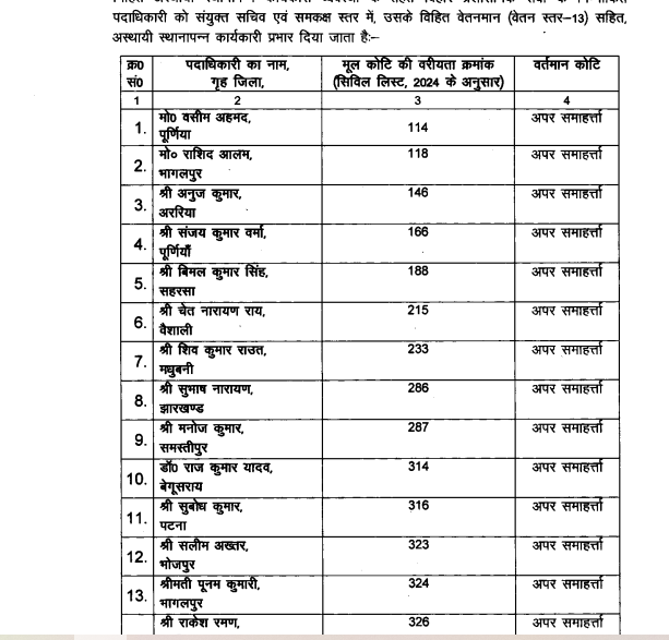 बिहार प्रशासनिक सेवा के 6 अधिकारियों को विशेष सचिव स्तर में प्रोन्नति दी गई है . वर्तमान में यह सभी अपर सचिव स्तर में थे, जिन्हें प्रमोट कर विशेष सचिव वेतनमान स्तर-14 में कार्यकारी प्रभार दिया गया है . जिन अधिकारियों को विशेष सचिव में प्रमोशन दिया गया है, उसमें डॉक्टर संजय कुमार , मीना कुमारी, प्रतिभा कुमारी, मनन राम, सुनील कुमार पांडे और गुफरान अहमद शामिल हैं . वहीं बिहार प्रशासनिक सेवा के 24 अधिकारियों को संयुक्त सचिव से अपर सचिव स्तर में प्रमोशन दिया गया है. 25 अधिकारियों को अपर समाहर्ता स्तर से संयुक्त सचिव स्तर में प्रोन्नति दी गई है.