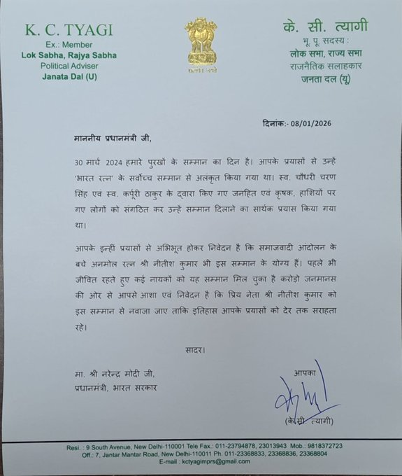 त्यागी ने आगे लिखा कि समाजवादी आंदोलन के बचे हुए अनमोल रत्न श्री नीतीश कुमार भी इस सम्मान के योग्य हैं। उन्होंने निवेदन किया कि नीतीश कुमार को भारतरत्न से सम्मानित किया जाए ताकि इतिहास में उनके योगदान को लंबे समय तक सराहा जा सके। नीतीश कुमार ने 2025 में 10वीं बार मुख्यमंत्री पद की शपथ ली है और उनके पास सबसे लंबे समय तक मुख्यमंत्री रहने का रिकॉर्ड है। भारतरत्न देश का सर्वोच्च नागरिक सम्मान है, जो राष्ट्रपति के सुझाव पर प्रधानमंत्री द्वारा प्रदान किया जाता है। इसके तहत राष्ट्रपति द्वारा हस्ताक्षरित प्रमाणपत्र और तमगा दिया जाता है।
