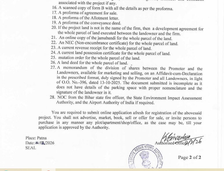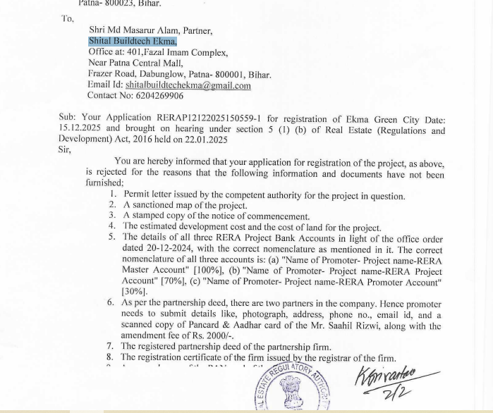 रेरा बिहार ने शीतल ब्यूल्डटेक एकमा के प्रोजेक्ट Ekma Green City का निबंधन देने से मना कर दिया है. रेरा ने कंपनी के निबंधन आवेदन को रद्द कर दिया है. निबंधन रद्द करने की पीछे Ekma Green City के लिए जरूरी कागज का नहीं होना. यहां तक तक प्रोजेक्ट का नक्शा पर उचित फोरम से पास नहीं है. रेरा ने इस संबंध में Shital Buildtech Ekma के पार्टनर को इस संबंध में जानकारी दे दी है. रेरा ने Ekma Green City के लिए आवेदन को रद्द करते हुए 28 कारण बताए हैं. यानि कंपनी ने बिना कागजात के ही रेरा निबंधन के लिए आवेदन किया था. जिसे रेरा 2 फरवरी 2026 को रद्द कर दिया है.
