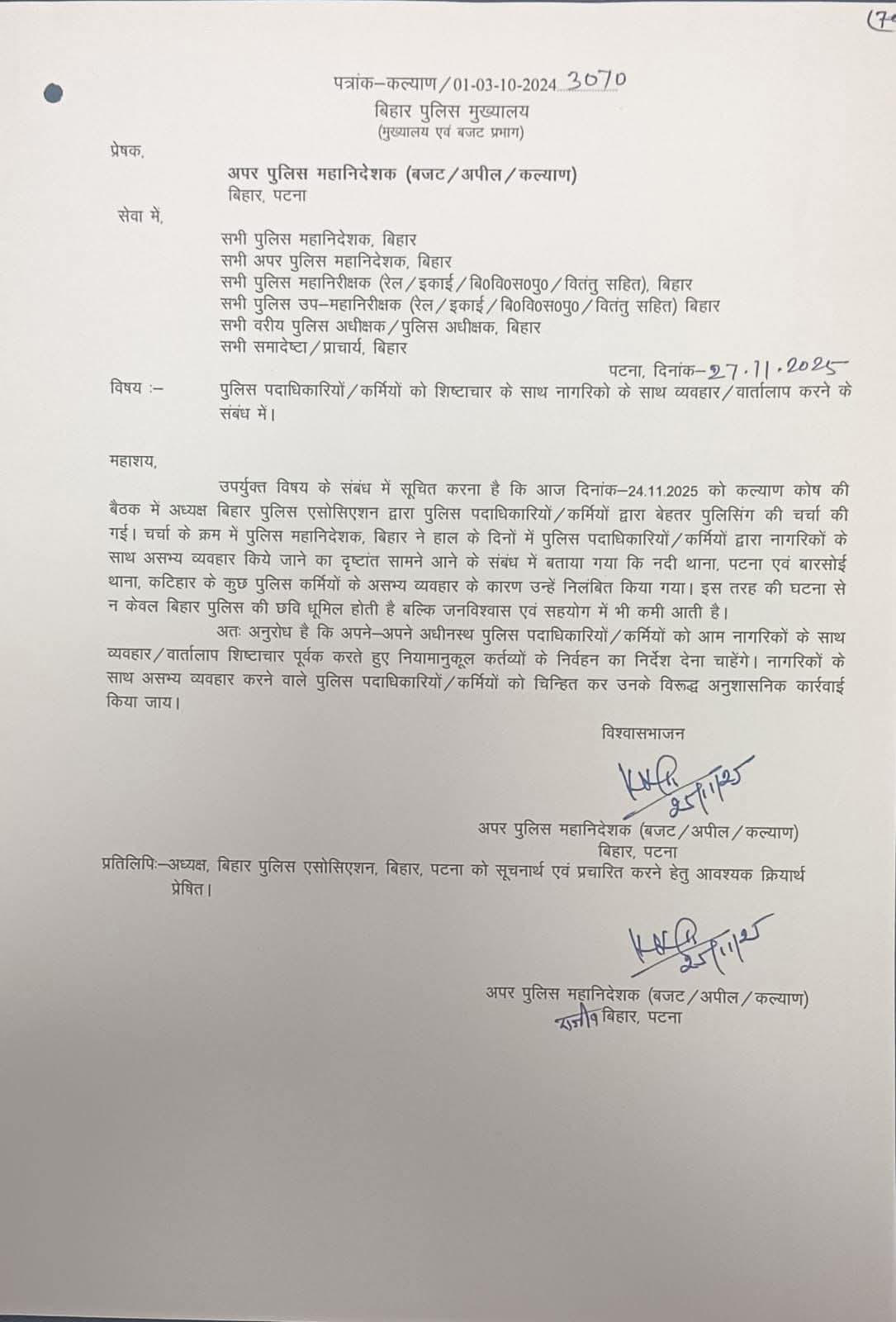 24 नवंबर को कल्याण कोष की बैठक में अध्यक्ष बिहार पुलिस एसोसिएशन द्वारा पुलिस पदाधिकारियों/ कर्मियों द्वारा बेहतर पुलिसिंग की चर्चा की गई। चर्चा के क्रम में पुलिस महानिदेशक, बिहार ने हाल के दिनों में पुलिस पदाधिकारियों/कर्मियों द्वारा नागरिकों के साथ असभ्य व्यवहार किये जाने का दृष्टांत सामने आने के संबंध में बताया गया कि नदी थाना, पटना एवं बारसोई थाना, कटिहार के कुछ पुलिस कर्मियों के असभ्य व्यवहार के कारण उन्हें निलंबित किया गया। इस तरह की घटना से न केवल बिहार पुलिस की छवि धूमिल होती है बल्कि जनविश्वास एवं सहयोग में भी कमी आती है।