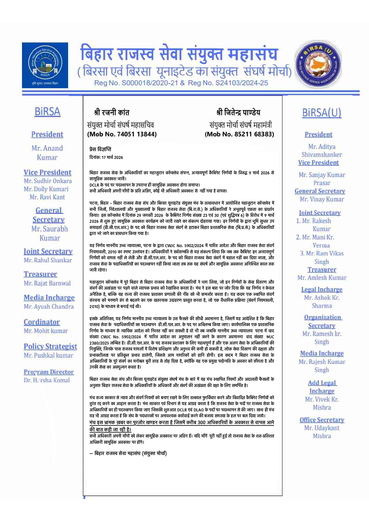 यह निर्णय माननीय उच्च न्यायालय, पटना के द्वारा CWJC No. 5902/2024 में पारित आदेश और बिहार राजस्व सेवा संवर्ग नियमावली, 2010 का स्पष्ट उल्लंघन है। अधिकारियों ने सर्वसम्मति से यह संकल्प लिया कि जब तक कैबिनेट इन अन्यायपूर्ण निर्णयों को वापस नहीं ले लेती और डी.सी.एल.आर. के पद को बिहार राजस्व सेवा संवर्ग में बहाल नहीं कर दिया जाता, और राजस्व सेवा के पदाधिकारियों का पदस्थापन नहीं किया जाता तब तक यह संघर्ष और सामूहिक अवकाश अनिश्चित काल तक जारी रहेगा।
