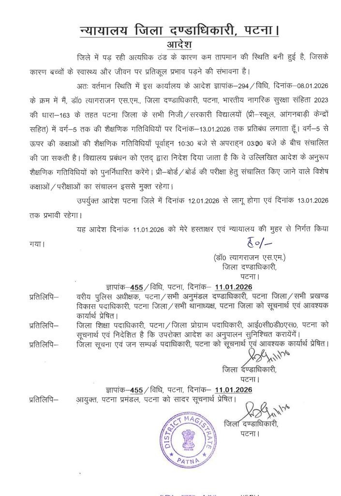पटना DM डॉ. त्यागराजन एस.एम. ने जारी आदेश से स्पष्ट होता है कि कक्षा 1 से लेकर 5 तक के सभी स्कूल 13 जनवरी तक बंद रहेंगे। कक्षा 5 से ऊपर के क्लास सुबह साढ़े दस बजे से लेकर 3 बजे तक खुले रहेंगे। इससे पहले या इसके बाद किसी भी तरह की शैक्षणिक गतिविधि नहीं कराई जाएगी। वही मैट्रिक की परीक्षा के लिए संचालित किये जाने वाले विशेष क्लास और एग्जाम भी इस दौरान होता रहेगा। जिला प्रशासन का कहना है कि छोटे बच्चों के स्वास्थ्य को ध्यान में रखते हुए यह फैसला लिया गया है, ताकि ठंड के कारण किसी भी तरह की परेशानी से उन्हें बचाया जा सके।