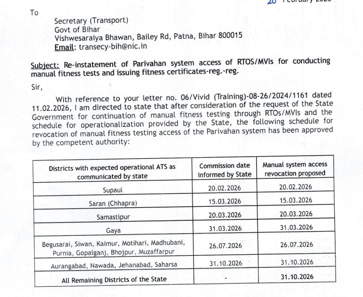 इस संबंध में सड़क परिवहन मंत्रालय ने बिहार के परिवहन सचिव को पत्र भेजा है. सारण जिले में 15 मार्च तक,समस्तीपुर में 20 और गया जिले में 30 मार्च तक मैन्यूअल तरीके से फिटनेस जांच की छूट दी गई है. वहीं बेगूसपाय, सिवान, कैमूर,मोतिहारी,मधुबनी,पूर्णिया,गोपालगंज,भोजपुर,मुजफ्फरपुर जिले में26 जुलाई तक मोटरयान निरीक्षकों को यह अधिकार दिया गया है. जबकि औरंगाबाद,नवादा,जहानाबाद,सहरसा में 31 अक्टूबर तक मोटरयान निरीक्षक मैन्यूअल तरीके से गाड़ियों का पिटनेस जांच कर सकते हैं.