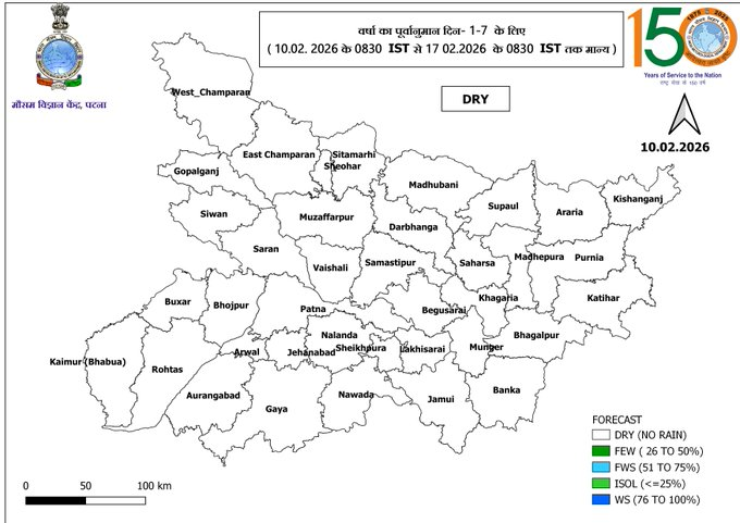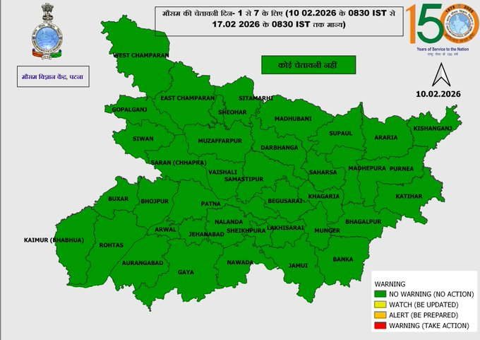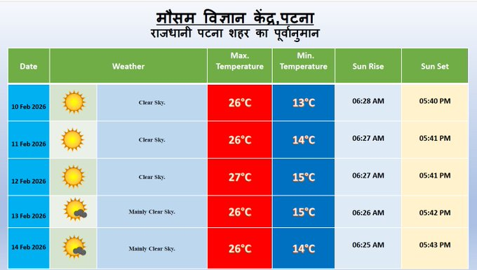 15 फरवरी के बाद दिन का तापमान 30℃ के पास पहुँचेगा। फिलहाल सुबह और शाम में कुहासा छाया रहेगा। दिन में धूप निकलने से मौसम साफ रहेगा। मौसम विभाग ने राजधानी पटना शहर का पूर्ववानुमान जारी किया है। 10 फरवरी को सुबह 6:28 से लेकर शाम 5:40 तक आसमान साफ रहेगा।