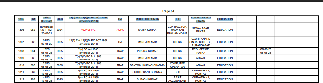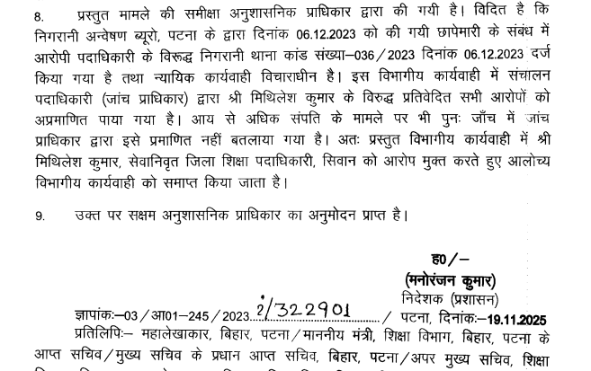 सिवान जिले के तत्कालीन जिला शिक्षा पदाधिकारी मिथिलेश कुमार के खिलाफ निगरानी ब्यूरो ने आय से अधिक संपत्ति अर्जित करने का केस दर्ज किया था. इसके बाद निगरानी टीम ने डीईओ मिथिलेश कुमार के सिवान से लेकर पटना तक छापेमारी की थी. डीए केस में रेड होने के बाद शिक्षा विभाग ने 12 दिसंबर 2023 को आरोपी डीईओ मिथिलेश कुमार को सस्पेंड कर दिया था. इसके बाद 6 दिसंबर 2024 के प्रभाव से मिथिलेश कुमार के खिलाफ अनुशासनिक कार्यवाही संचालित की गई। विभाग के संयुक्त सचिव सुनील कुमार को संचालन पदाधिकारी नियुक्त किया गया. इनके खिलाफ कुल तीन आरोप थे. जिसमें दूसरे नंबर पर निगरानी थाना कांड सं- 36/2023 से संबंधित आरोप थे. इसी बीच मिथिलेश कुमार 31 जुलाई 2024 को सेवानिवृत हो गए। इसके बाद इनके खिलाफ जारी अनुशासनिक कार्यवाही को पेंशन नियमावली के तहत कार्यवाही में बदल दी गई।