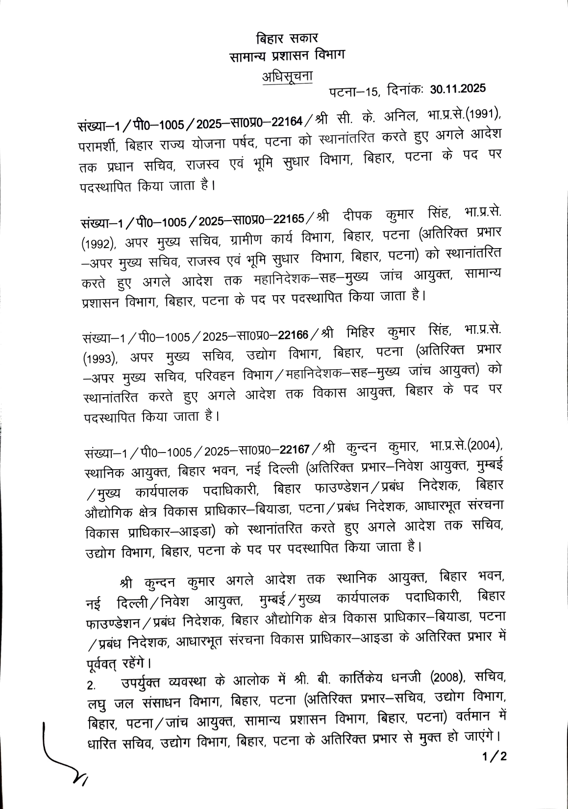 सरकार ने भारतीय प्रशासनिक सेवा के 1991 बैच के सीनियर आईएएस अधिकारी सी के अनिल को राजस्व एवं भूमि सुधार विभाग के प्रधान सचिव के पद पर तैनात कर दिया है। सी के अनिल इससे पहले बिहार राज्य योजना पर्षद, पटना के परामर्शी के तौर पर पदस्थापित थे।
