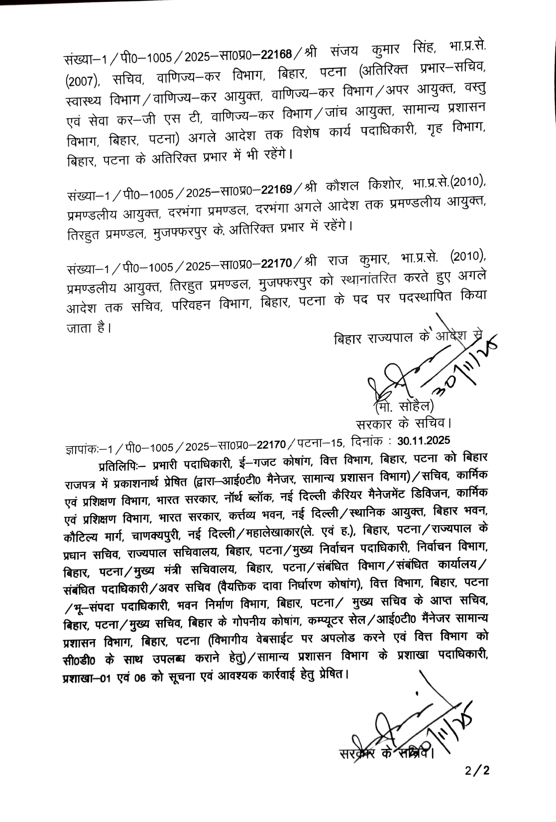 वहीं नीतीश सरकार ने विकास आयुक्त के पद पर वरिष्ठ आईएएस अधिकारी मिहिर कुमार सिंह को पदस्थापित किया है। वर्तमान में मिहिर सिंह उद्योग विभाग के ACS के पद पर पदस्थापित थे। तिरहुत प्रमंडल के प्रमंडलीय आयुक्त राजकुमार को स्थानांतरित करते हुए परिवहन विभाग का सचिव बनाया गया है।