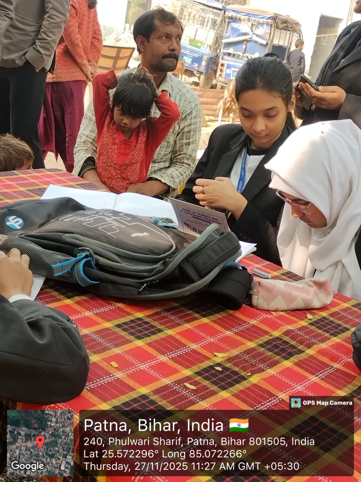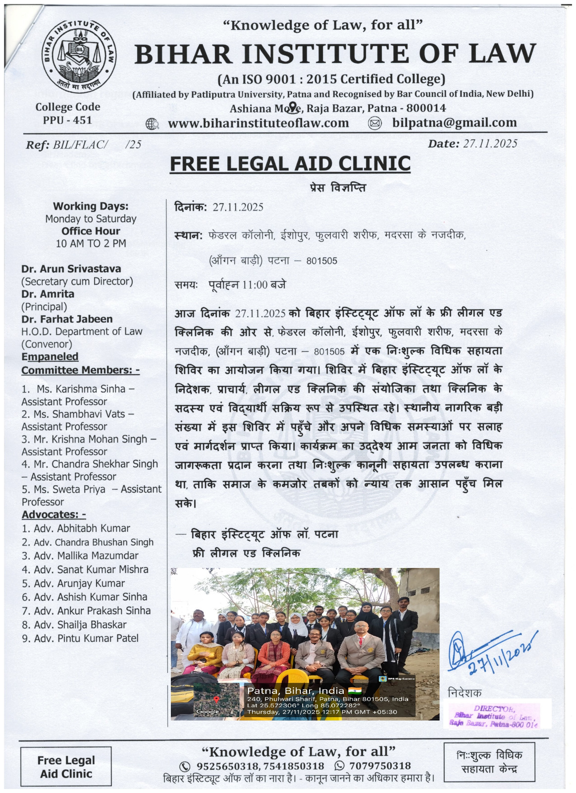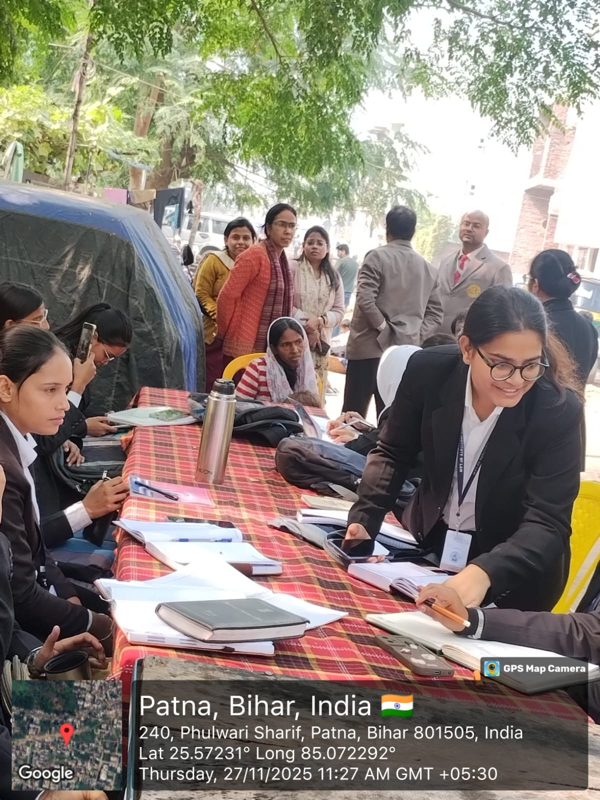 बिहार इंस्टिट्यूट ऑफ लॉ के फ्री लीगल एड क्लिनिक की ओर आयोजित निशुल्क विधिक सहायता शिविर का लाभ स्थानीय लोगों ने उठाया। इस दौरान उन्होंने अपनी समस्या रखी, जहां उन्हें कानूनी सलाह दी गयी। इस शिविर में आने के बाद लोगों को कई कानूनी जानकारी मिली जिसके बारे में उन्हें पता तक नहीं था। बता दें कि बिहार इंस्टिट्यूट ऑफ लॉ का यह नारा है..कानून जानने का अधिकार हमारा है।