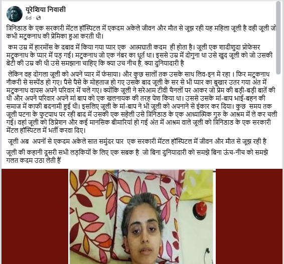 लव-सेक्स और क्राइम पर मटूकनाथ का पोस्ट - फ़ोटो सोशल मीडिया