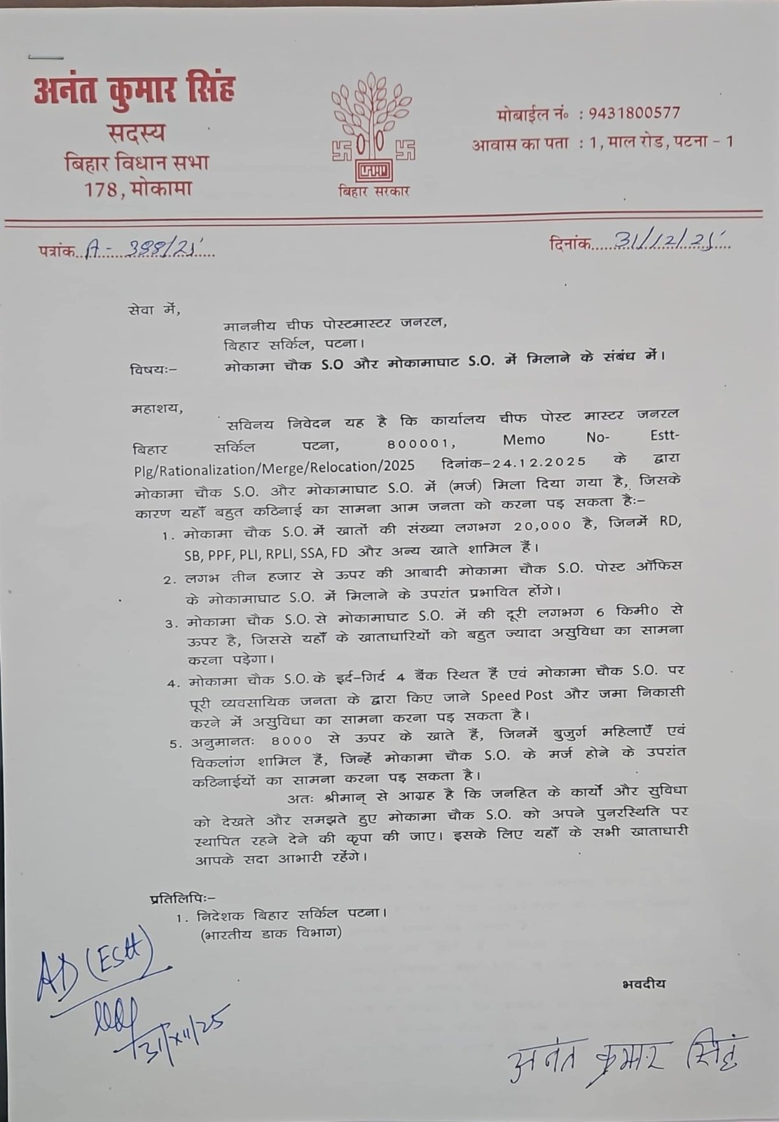 उनके नाम से यह लेटर चीफ पोस्टमास्टर जनरल, बिहार सर्किल, पटना को लिखा गया है। जो मोकामा चौक एसओ और मोकामा घाट एसओ में मिलाने के संबंध लिखा गया है। इसकी प्रतिलिपि भारतीय डाक विभाग के निदेशक बिहार सर्किल पटना को भी भेजी गयी है। आश्चर्य की बात है कि अनंत सिंह अभी जेल में हैं और उनके नाम से लेटर 31 दिसंबर 25 को लिखा गया है। इस पत्र में अनंत सिंह का साइन भी दिख रहा है। सोशल मीडिया पर अनंत सिंह का यह लेटर वायरल हो रहा है, जिसकी पुष्टि फर्स्ट बिहार नहीं करता है। वायरल इस लेटर में क्या लिखा गया है आप खुद पढ़ें...