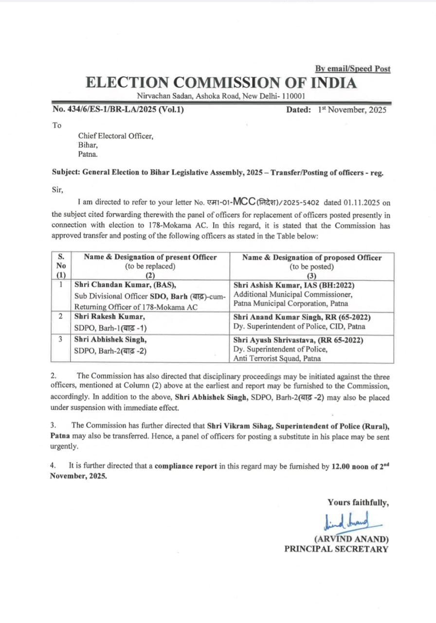 बाढ़ के एसडीओ चंदन कुमार को हटाकर आईएएस अफसर आशिष कुमार को वहां भेजा गया है। वही बाढ़ एसडीपीओ 1 राकेश कुमार की जगह सीआईडी के डीएसपी आनंद कुमार सिंह को तैनात किया गया है। जबकि बाढ़ एसडीपीओ 2 अभिषेक सिंह की जगह एटीएस के डीएसपी आयुष श्रीवास्तव को तैनात किया गया है। वही पटना के ग्रामीण एसपी विक्रम सिहाग को आयोग ने हटाने का आदेश दिया है। 2 नवम्बर को दोपहर 12 बजे तक इस हत्याकांड की रिपोर्ट मांगी गयी है। बता दें कि दुलारचंद यादव की हत्या के बाद चुनाव आयोग ने बिहार के डीजीपी और पटना डीएम से रिपोर्ट मांगी थी। जिसके बाद आज यह कार्रवाई की गयी है।