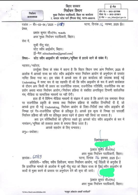 अपर मुख्य निर्वाचन पदाधिकारी, प्रशांत कुमार सीएच ने यह आदेश जारी किया। लेटर में इस बात का जिक्र है कि जब नीतू चंद्रा को राज्य का स्टेट स्वीप आईकॉन बनाया गया था, तब उन्होंने अंदरटेकिंग दी थी कि स्वीप आइकॉन के रूप में अपने कार्यकाल के दौरान वह किसी भी प्रकार का राजनीतिक बयानवाजी, राजनीतिक गतिविधि, राजनीतिक मंच का प्रयोग, मीडिया या सामाजिक माध्यमों से चुनाव से संबंधित अनाधिकृत टिप्पणी नहीं करेंगी।