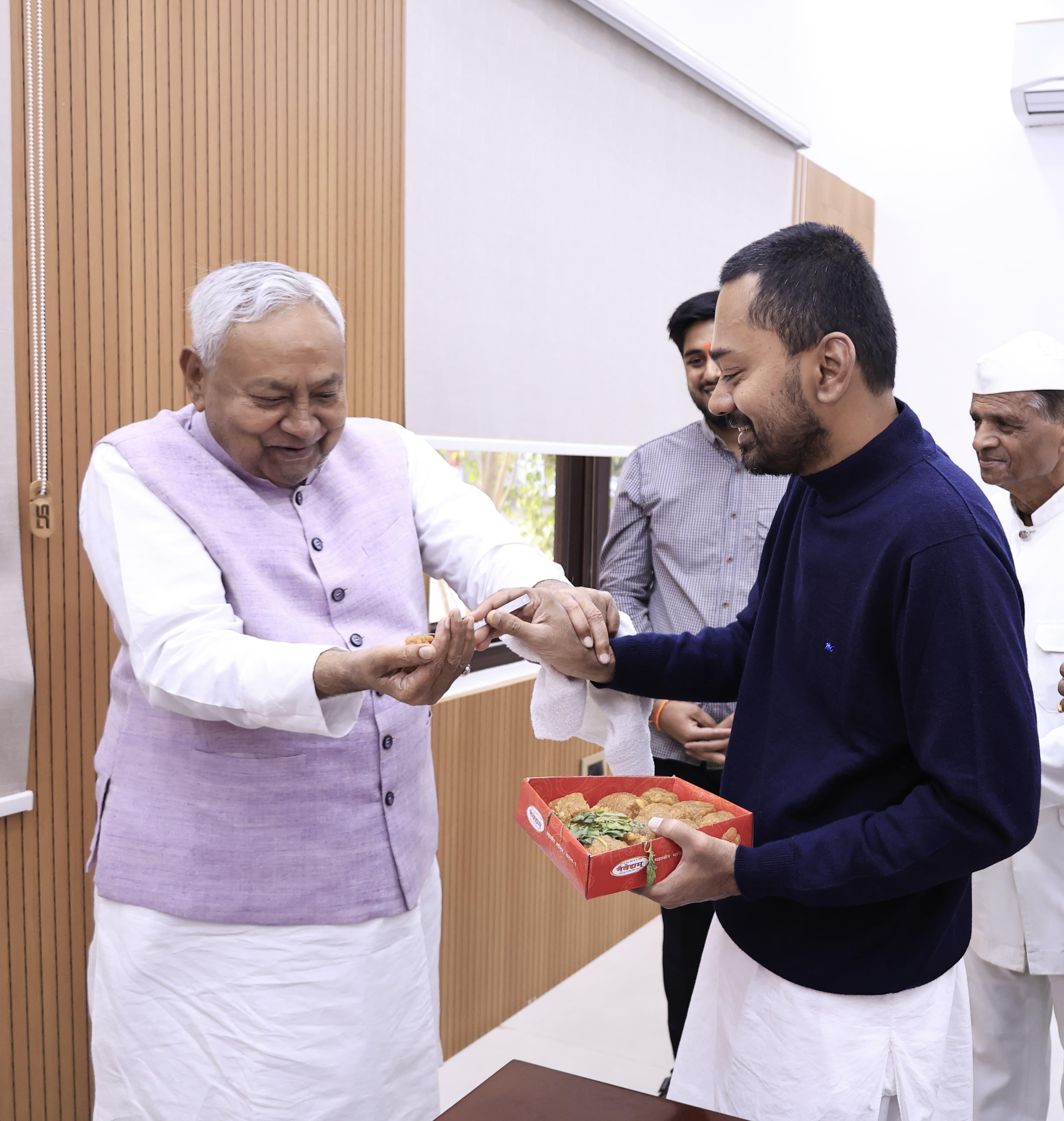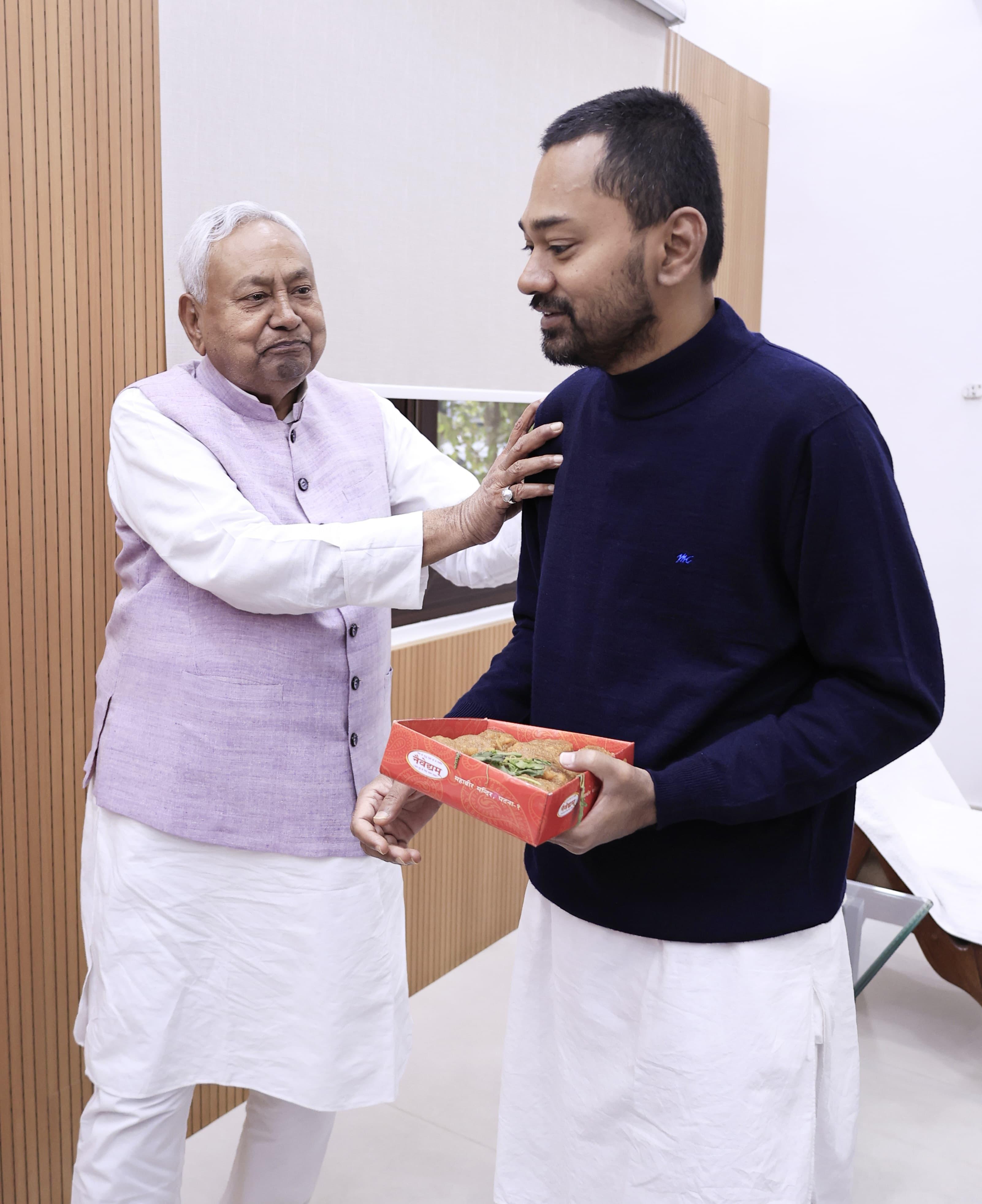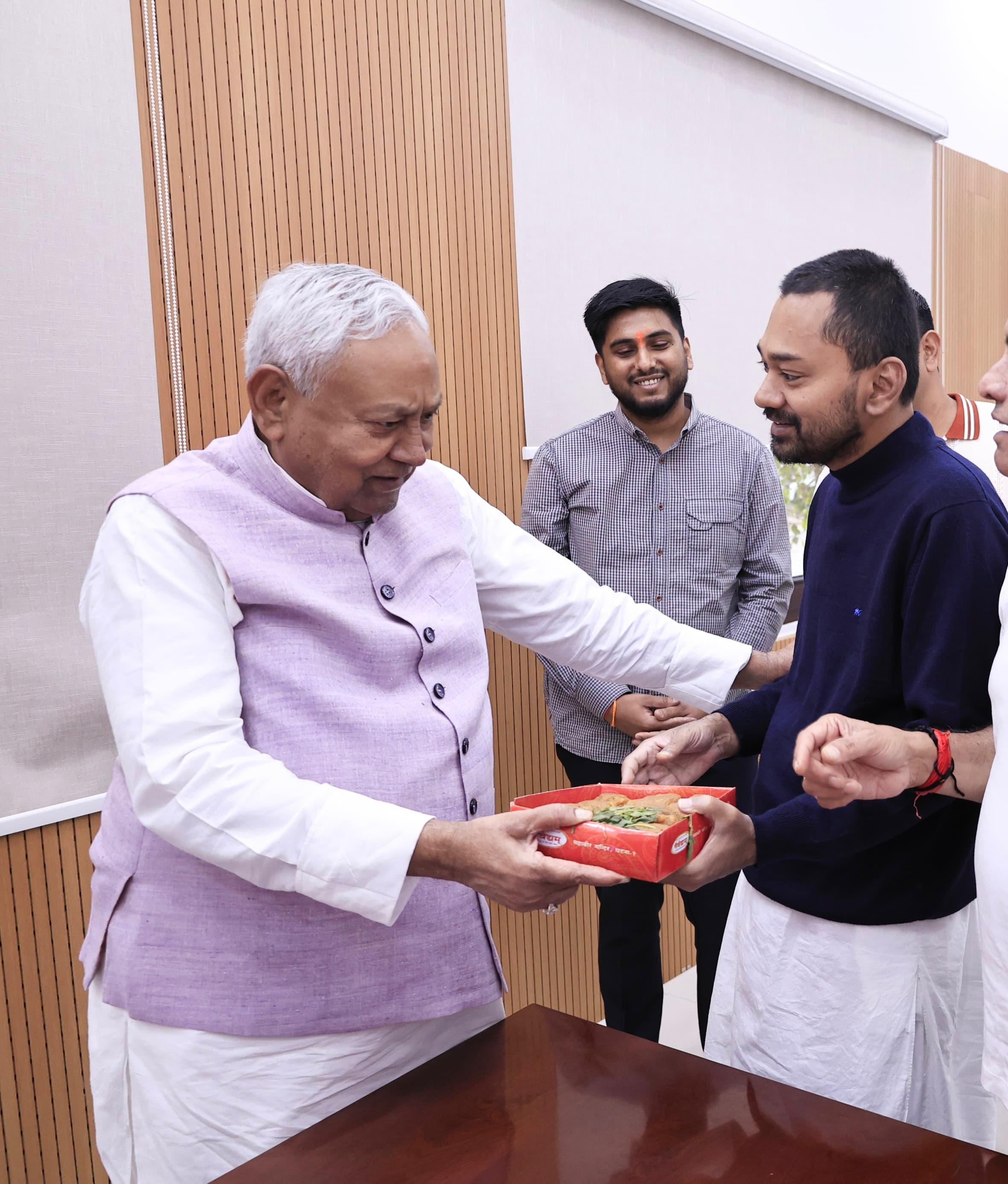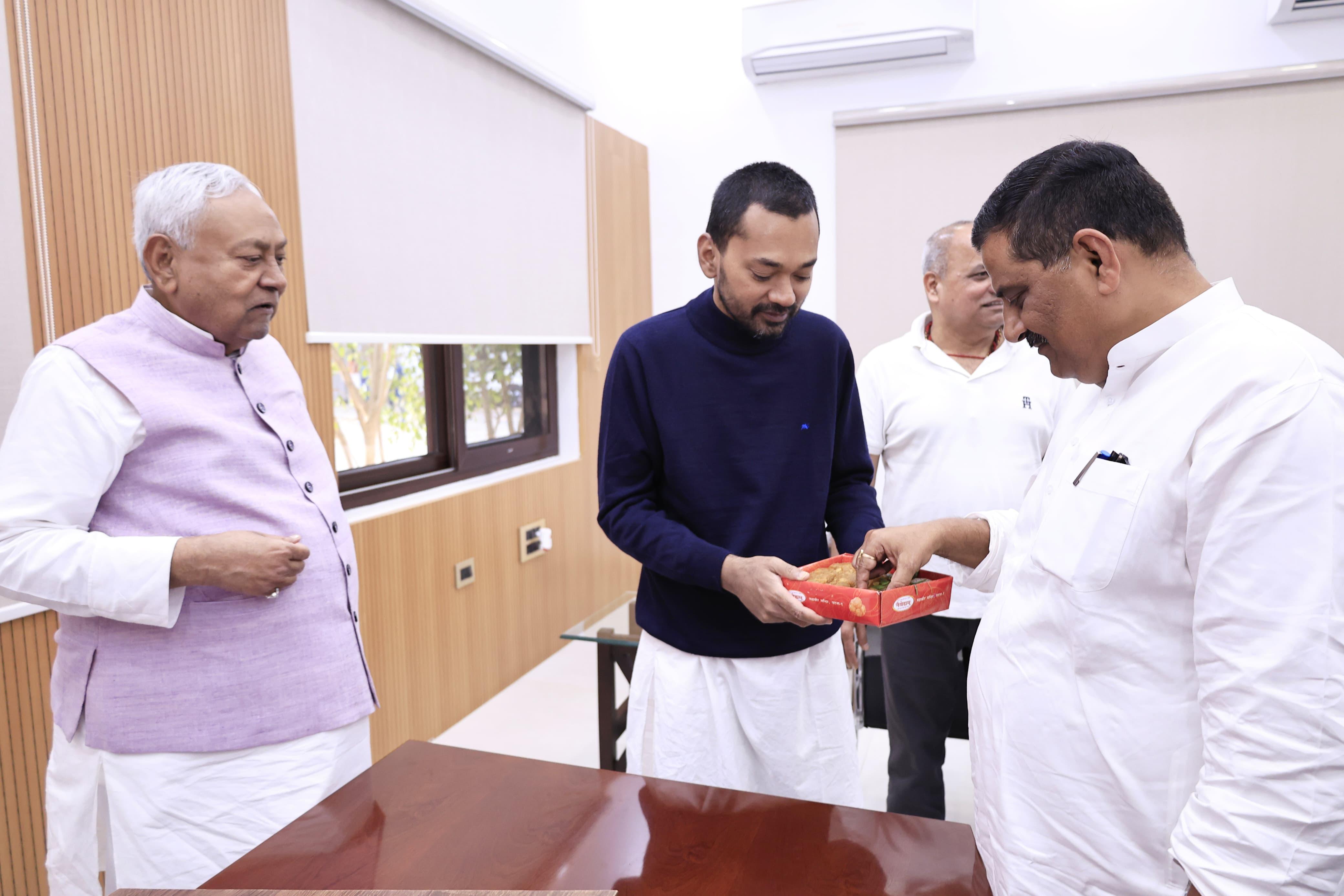 PATNA: बिहार के मुख्यमंत्री नीतीश कुमार का आज जन्मदिन है। रविवार को वो 75 साल के हो गये हैं। सीएम नीतीश ने अपना 75वां बर्थडे मुख्यमंत्री आवास में केक काटकर मनाया। इस मौके पर उनके बेटे निशांत और परिवार के सभी लोग मौजूद रहे। सभी ने नीतीश कुमार को जन्मदिन की शुभकामनाएं दी। इससे पहले निशांत ने पटना के महावीर मंदिर में जाकर पूजा अर्चना की और पिता की दीर्घायू की कामना की। मंदिर से घर लौटने के बाद निशांत ने पिता नीतीश कुमार को प्रसाद खिलाया। परिवार के सदस्यों ने नीतीश कुमार को जन्मदिन की बधाई दी।