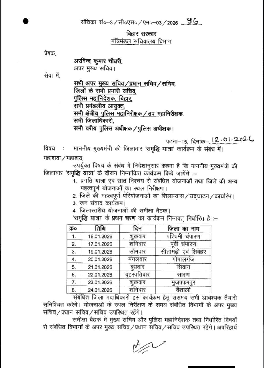 PATNA: बिहार के मुख्यमंत्री नीतीश कुमार आगामी 16 जनवरी, 2026 से राज्यव्यापी 'समृद्धि यात्रा' का पहला चरण शुरू करने जा रहे हैं। इसका उद्धेश्य सुशासन को मजबूत करना और राज्य भर में चल रही विकास परियोजनाओं की जमीनी हकीकत का जायजा लेना है। मंत्रिमंडल सचिवालय विभाग द्वारा जारी आधिकारिक अधिसूचना के अनुसार, इस यात्रा के लिए व्यापक तैयारियां चल रही हैं।