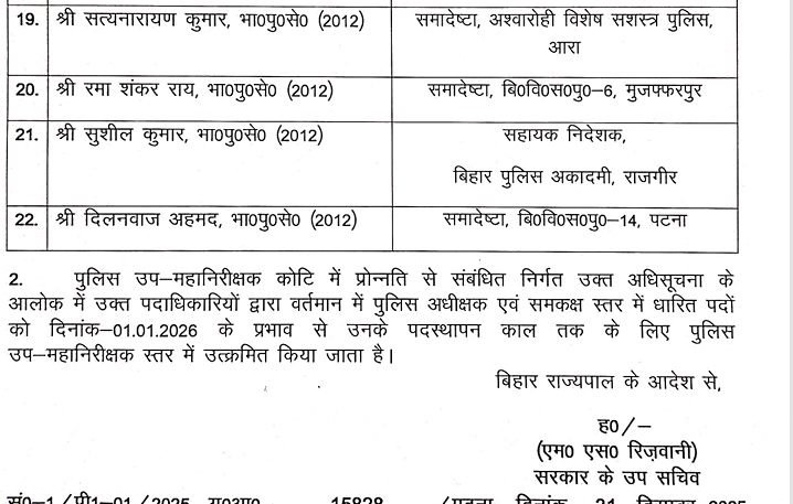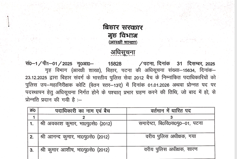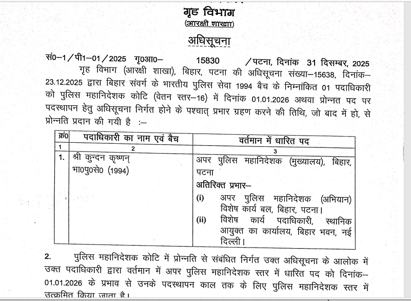 Bihar Ips Transfer: बिहार में आईपीए अधिकारियों के धारित पद को अपग्रेड किया गया है। प्रमोशन के बाद भी कुंदन कृष्णन पुलिस हेड क्वार्टर में बने रहेंगे। गृह विभाग ने इसकी अधिसूचना जारी कर दी है। देखिये पूरी लिस्ट..