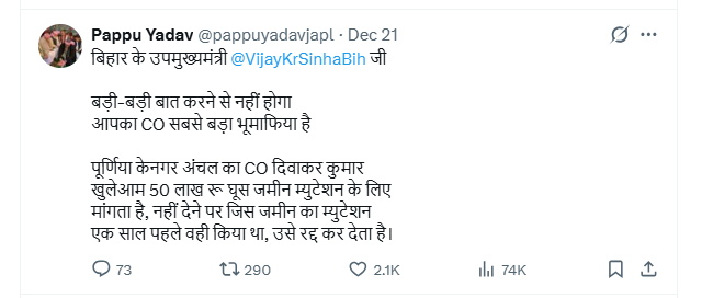 पप्पू यादव ने विजय सिन्हा से कहा कि आपका CO सबसे बड़ा भूमाफिया है। पूर्णिया के नगर अंचल का CO दिवाकर कुमार जमीन के म्युटेशन के लिए खुलेआम 50 लाख रूपये घूस मांगता है। घूस नहीं देने पर जिस जमीन का म्युटेशन एक साल पहले वही किया था, उसे रद्द कर देता है और आप बड़ी-बड़ी बातें करते हैं।