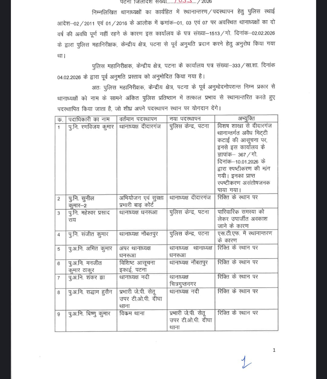 पटना पुलिस द्वारा जारी आदेश के अनुसार यह प्रशासनिक फेरबदल कानून-व्यवस्था को और बेहतर बनाने के उद्देश्य से किया गया है। अन्य थानों में भी थानाध्यक्षों के स्थानांतरण और नई पोस्टिंग की सूची जारी की गई है। नीचे देखिये पूरी लिस्ट..